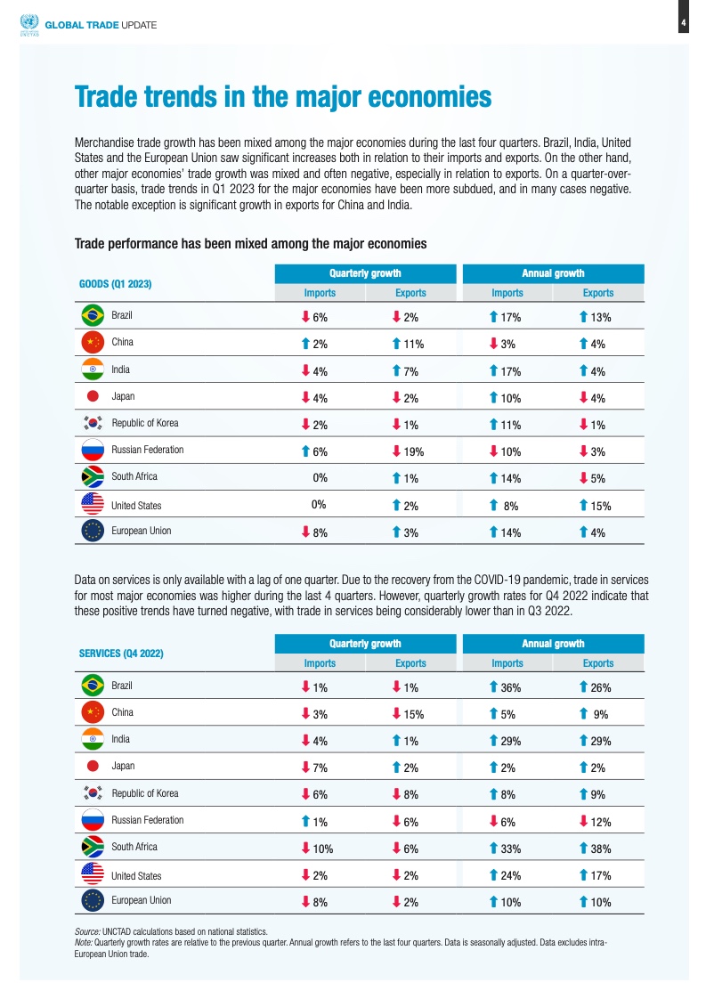 但从季度来看,2023年1月至3月,主要经济体的贸易趋势较为低迷,在许多情况下是负增长。不过,中国和印度的出口出现大幅增长。