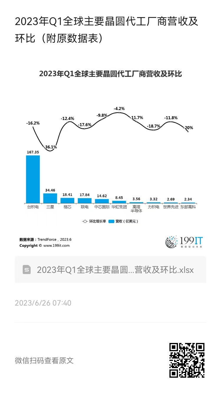 - 2023年Q2全球主要晶圆代工厂商营收及环比(附原数据表)