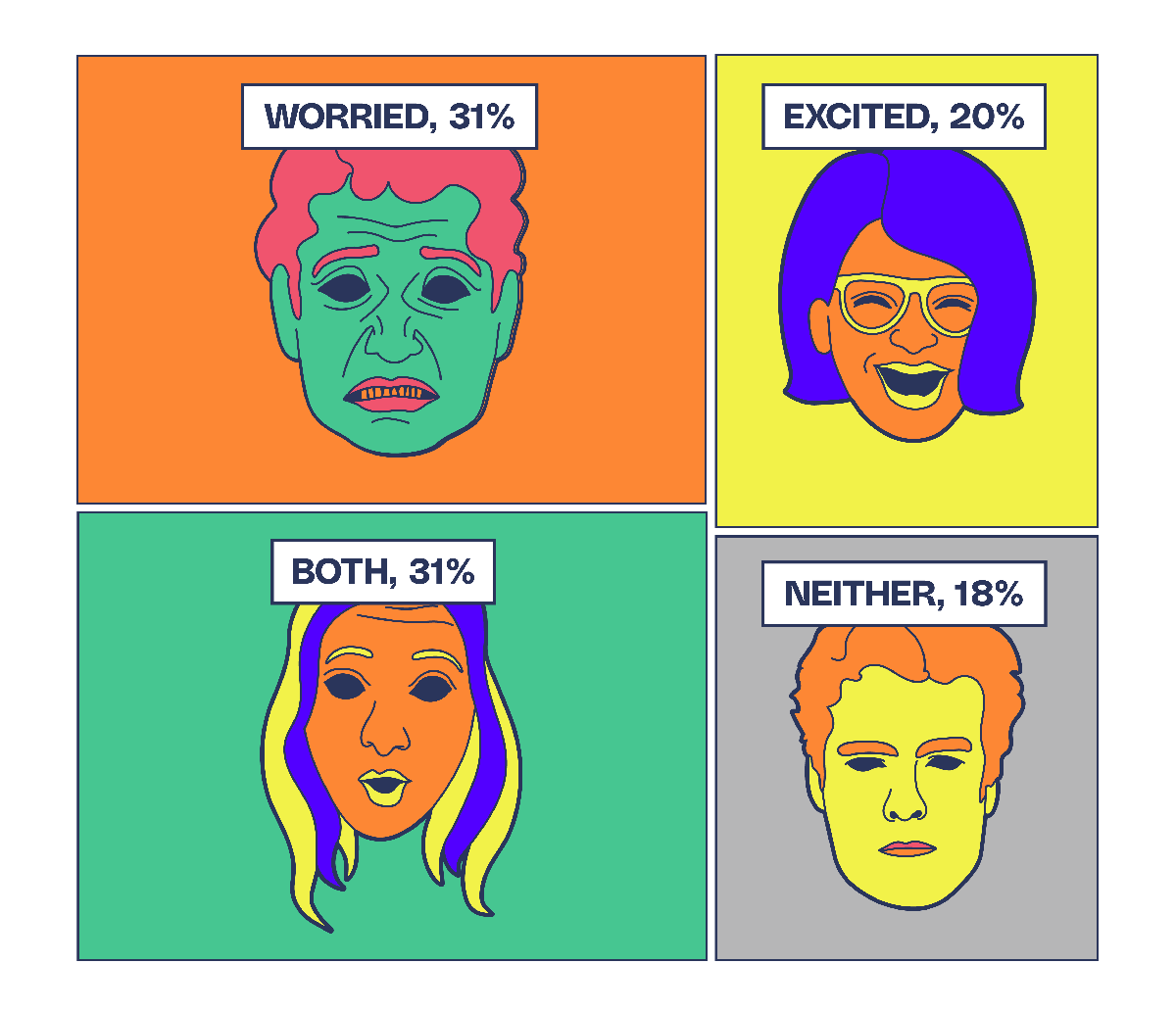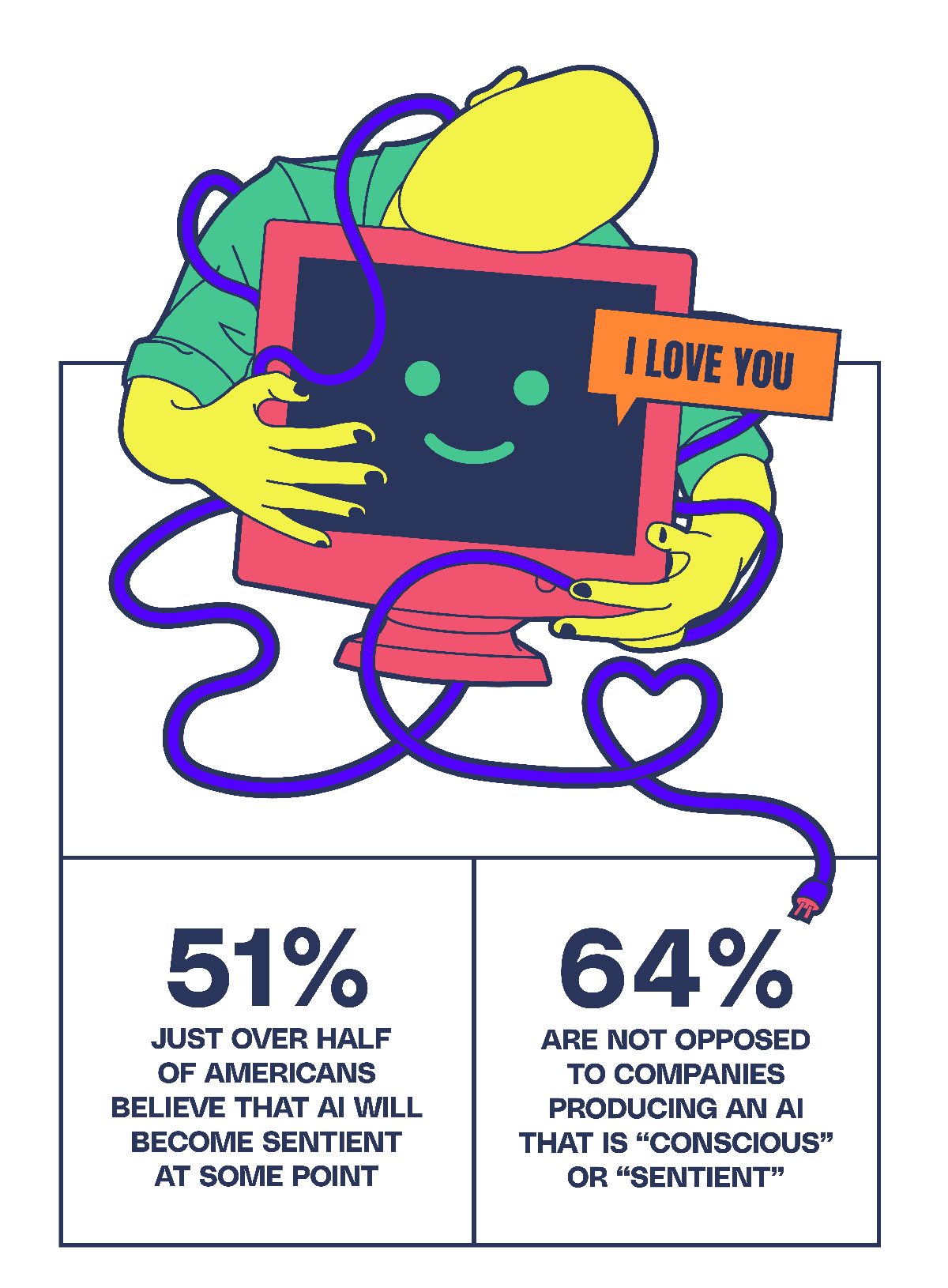 超过一半的受访者认为,未来人们将与人工智能发展情感关系,超过三分之一的人承认,如果他们感到孤独,他们会愿意这样做。近38%的人担心,人工智能会对人类文明构成威胁。当被问及人工智能对社会的影响时,大多数人预测了负面的结果,包括失业,隐私威胁,以及政府/企业的滥用。