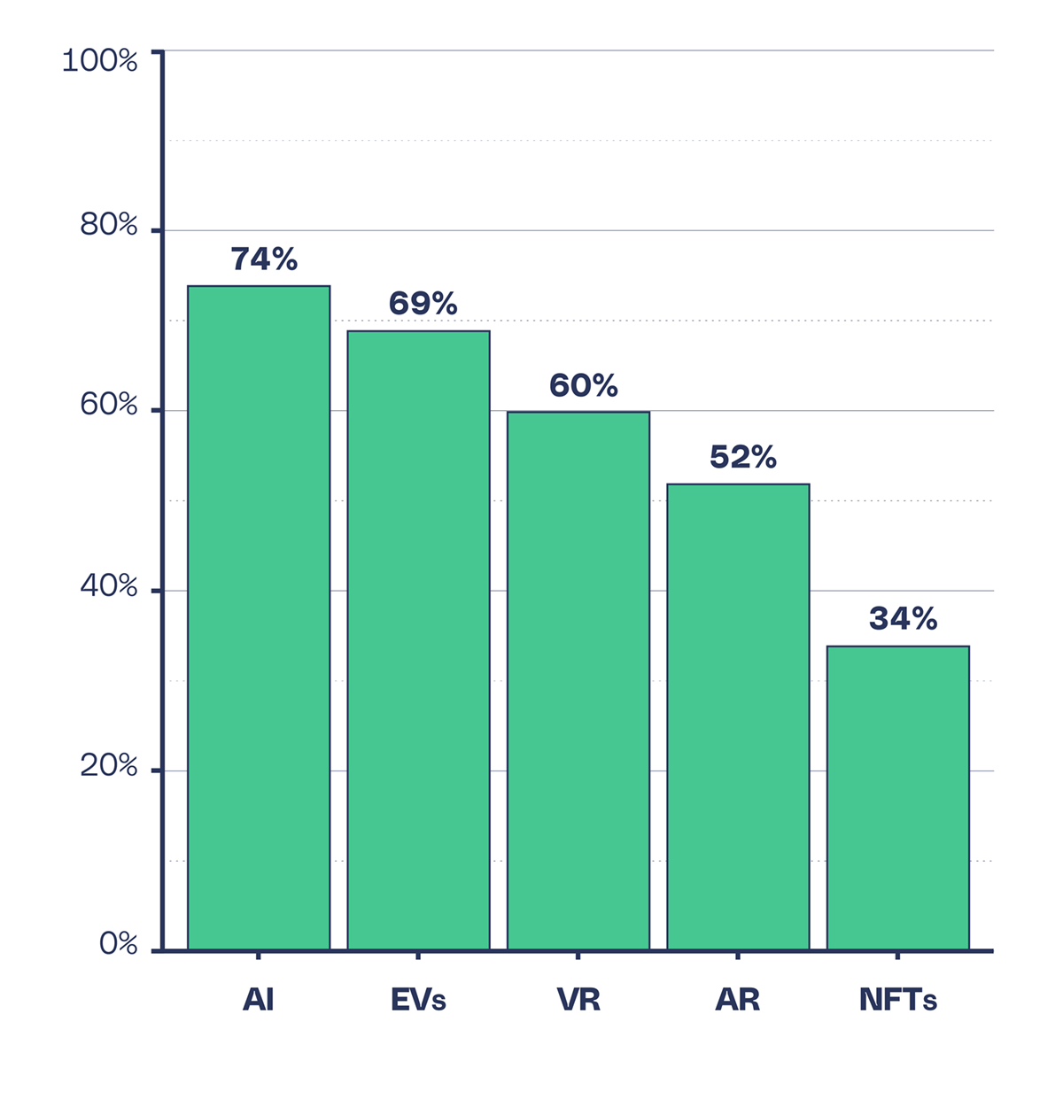 有趣的是,Z世代谈论人工智能的频率比任何其他群体都高,有61%的Z世代报告说它是一个谈话的话题,令人吃惊。值得注意的是,消费者表示希望在数字材料中清晰明确地披露人工智能的使用情况,78%的人表示同意。令人印象深刻的是,47%的人认为人工智能将在不同程度上颠覆他们的工作领域。最明显的是,69%的受访者同意,社会有必要进行重大变革,以适应后人工智能世界。