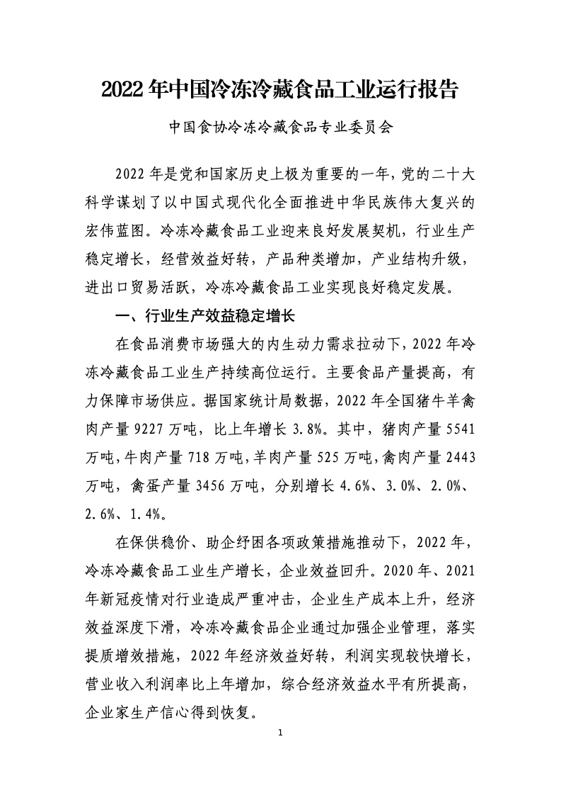 在食品消费市场强大的内生动力需求拉动下,2022年冷冻冷藏食品工业生产持续高位运行。主要食品产量提高,有力保障市场供应。据国家统计局数据,2022 年全国猪牛羊禽肉产量 9227 万吨,比上年增长3.8%。其中,猪肉产量5541万吨,牛肉产量 718 万吨,羊肉产量525 万吨,禽肉产量2443万吨,禽蛋产量 3456 万吨,分别增长4.6%、3.0%、2.0%、2.6%、1.4%。
