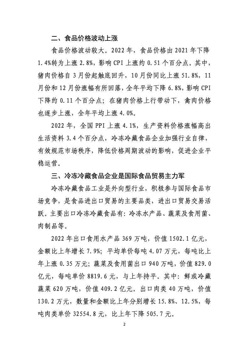 2022 年,全国 PPI 上涨 4.1%,生产资料价格涨幅高出生活资料 3.4 个百分点,冷冻冷藏食品企业加强行业自律,有效规范市场秩序,降低价格周期波动的影响,促进企业平稳运营。