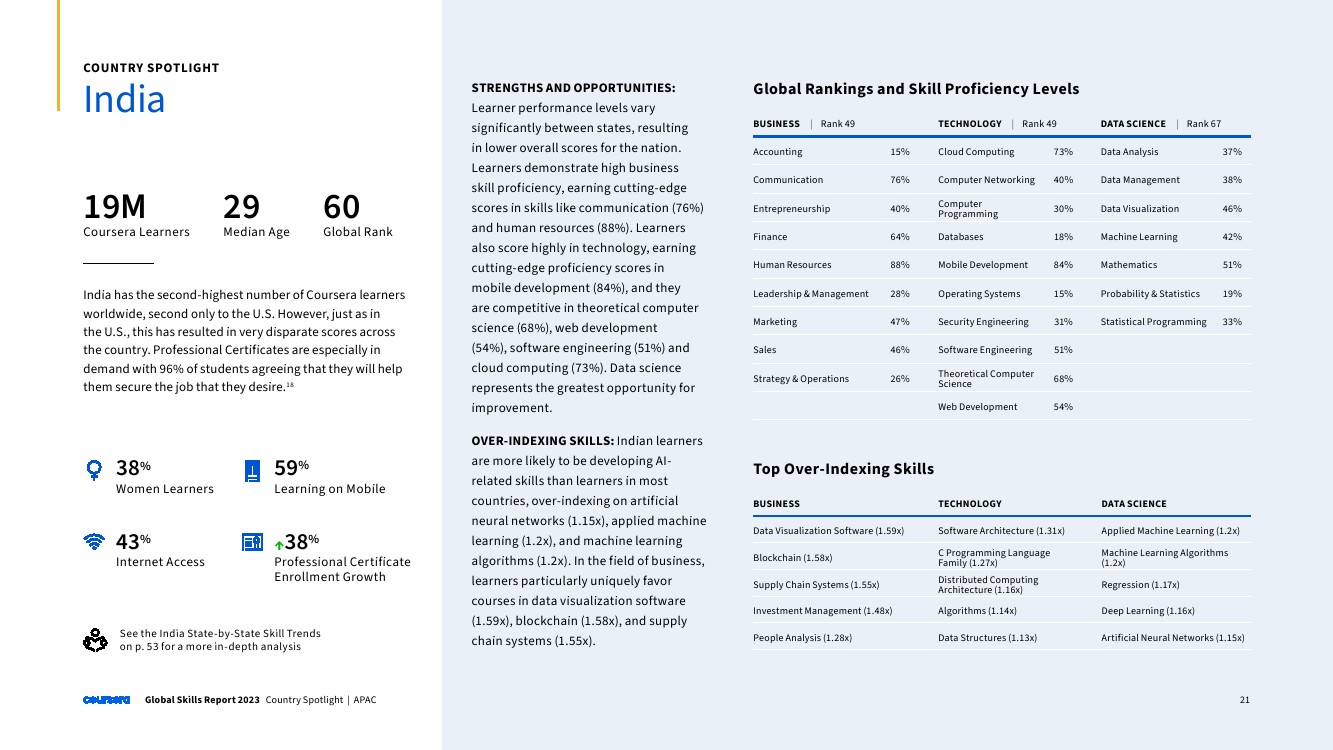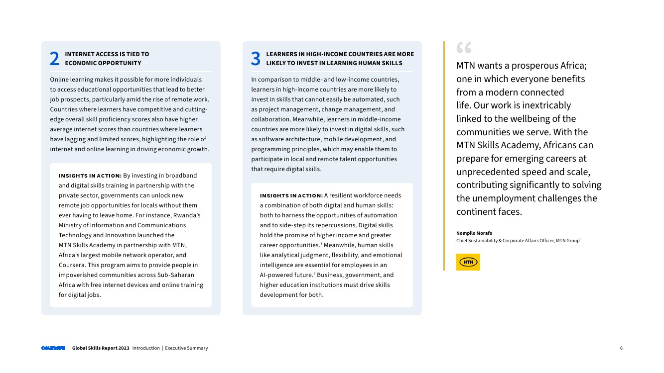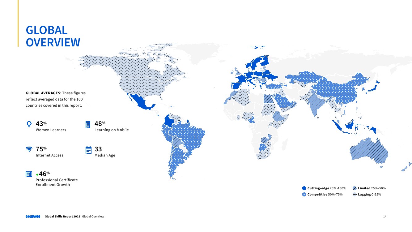 在线学习使更多的人有可能获得教育机会,从而获得更好的就业前景,特别是在远程工作兴起的背景下。学习者总体技能熟练程度得分具有竞争力和领先优势的国家,其互联网平均得分也高于落后国家。