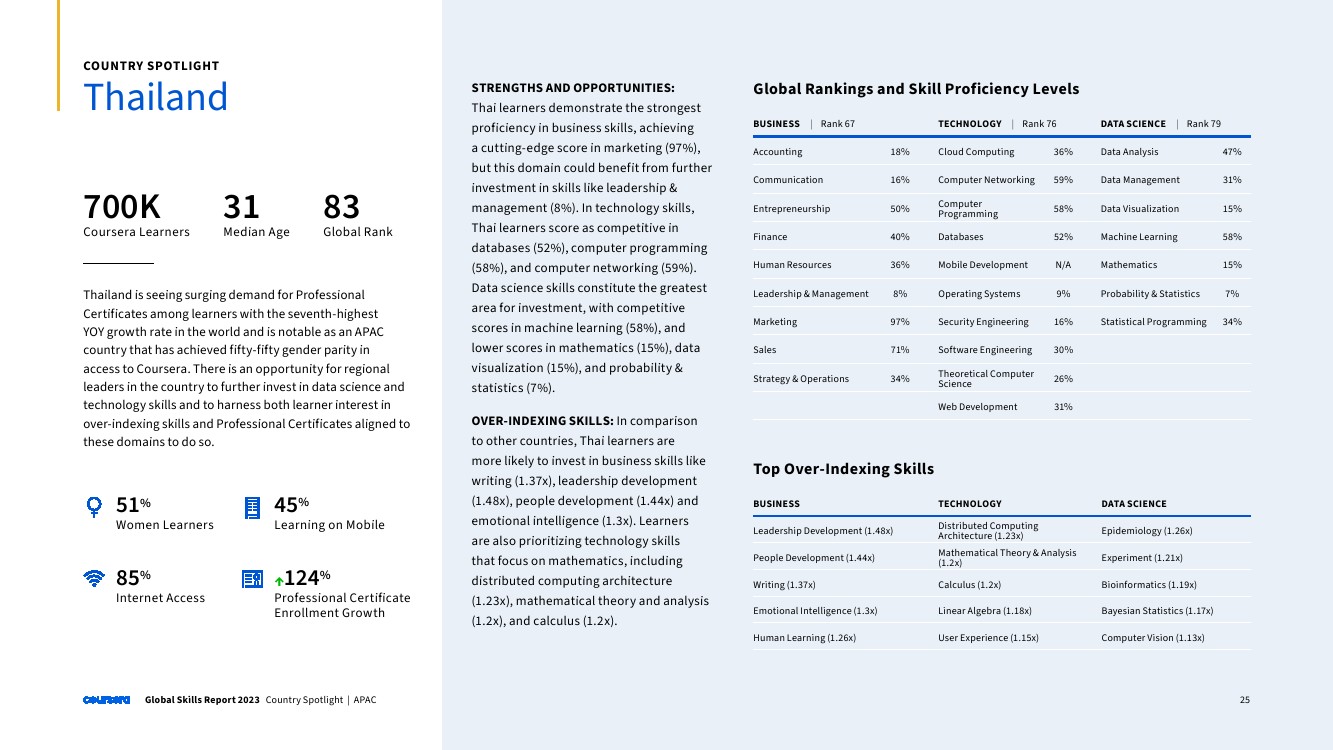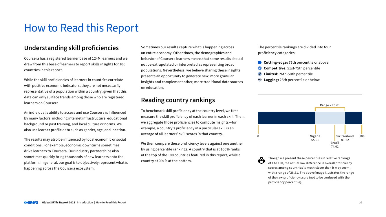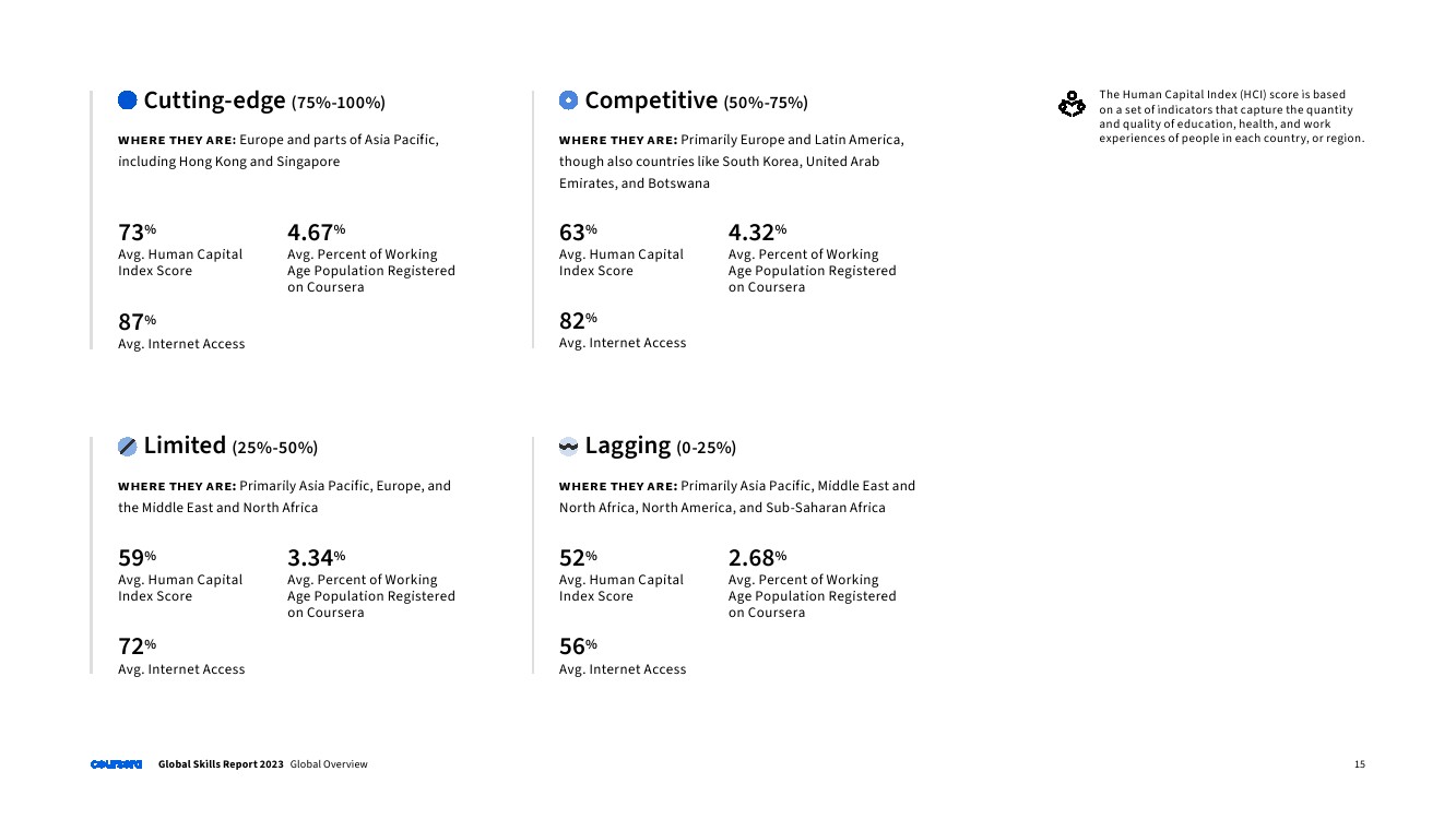 较高的技能熟练程度与人力资本潜力和创新等经济进步之间存在很强的相关性,值得注意的是,学习者表现出尖端熟练程度的国家的综合人均国内生产总值大约是落后国家的四倍。