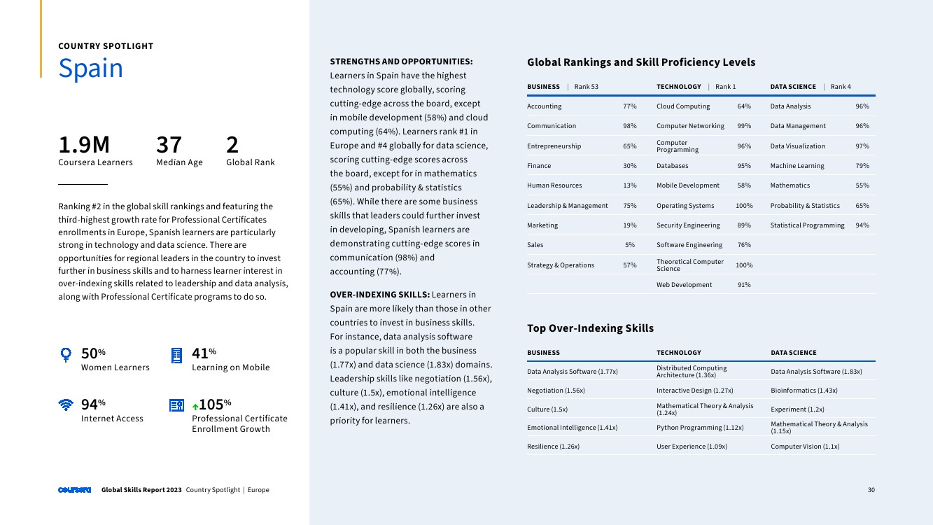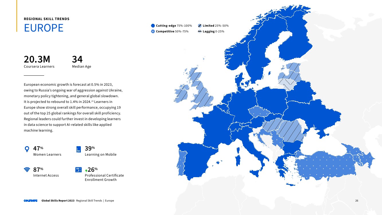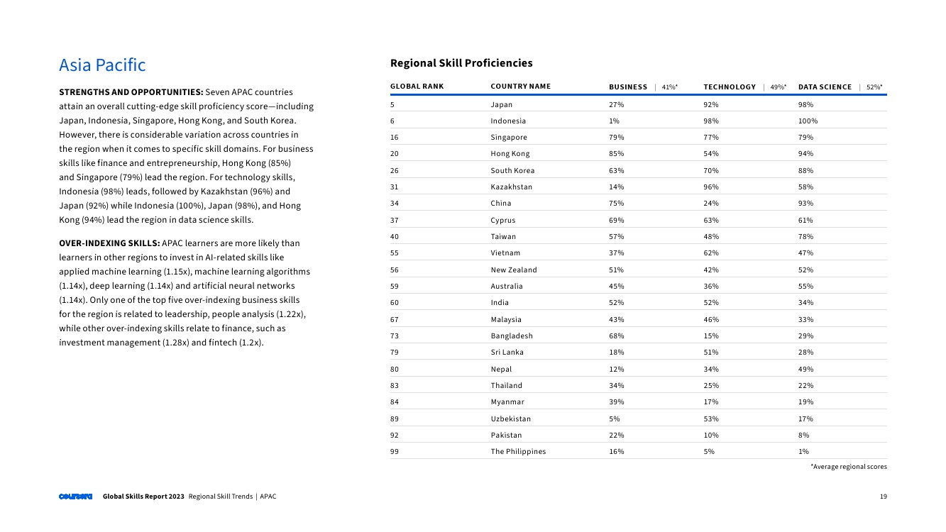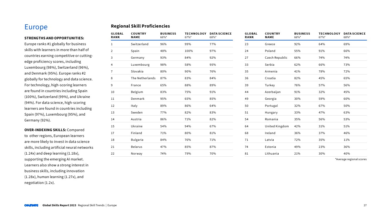 欧洲在全球技能排名中领先,前十名中有八个国家来自欧洲。剩下的两个是印度尼西亚和日本。欧洲学生在商业技能方面表现突出,而拉丁美洲和加勒比地区的学生在技术和数据科学方面领先。