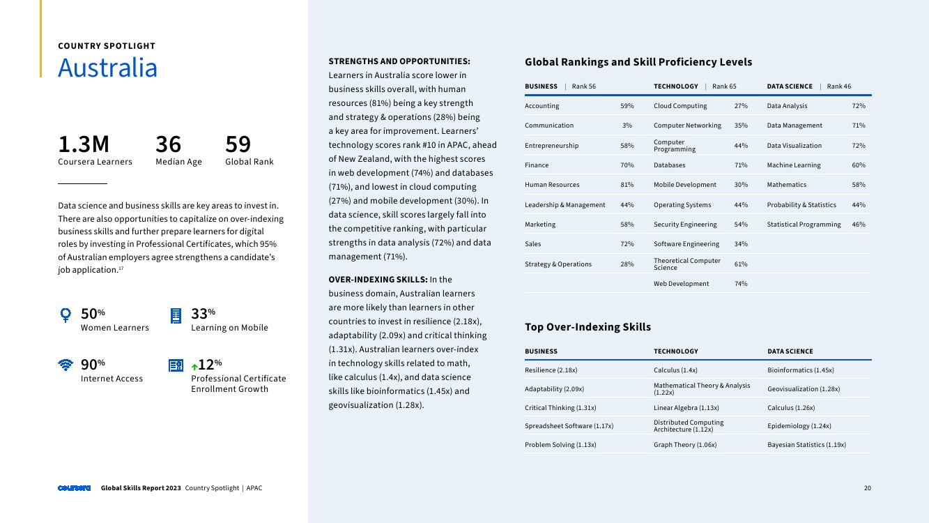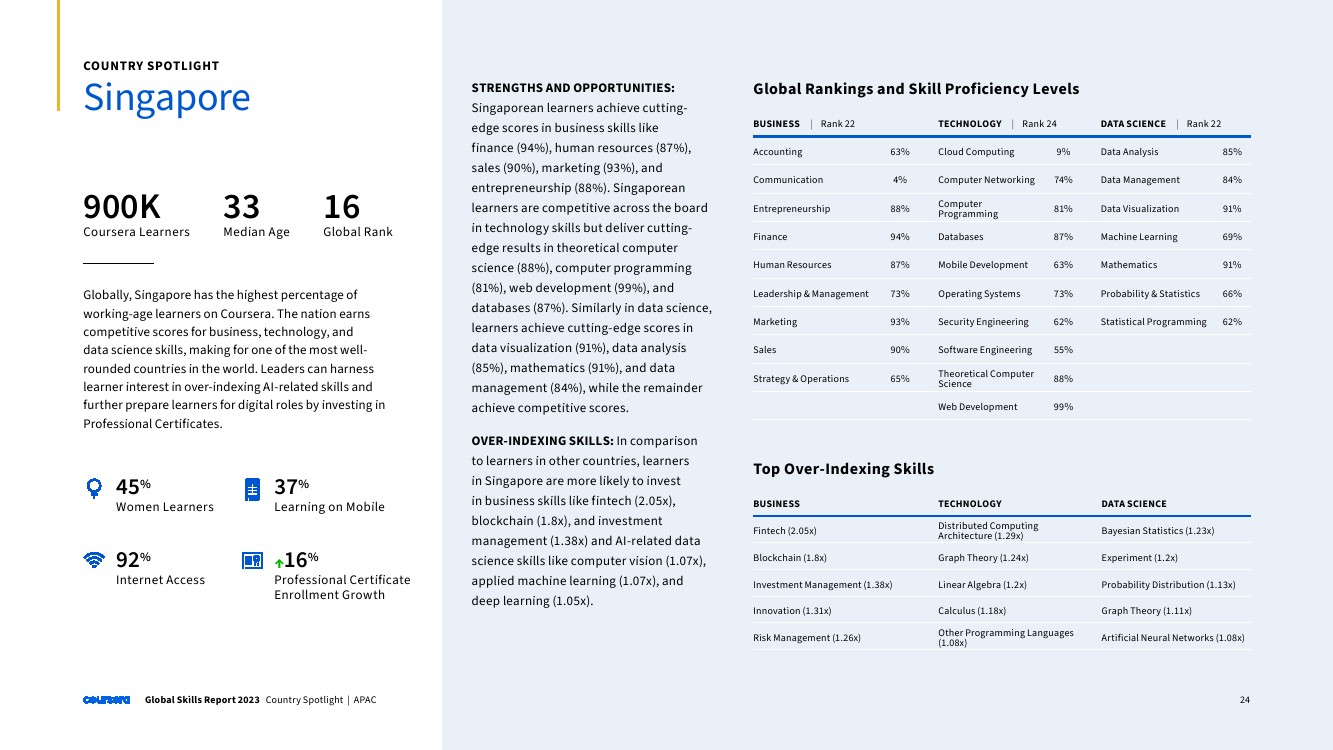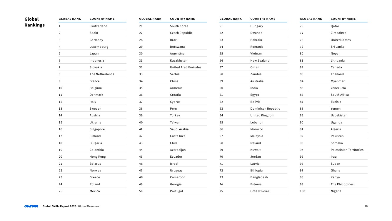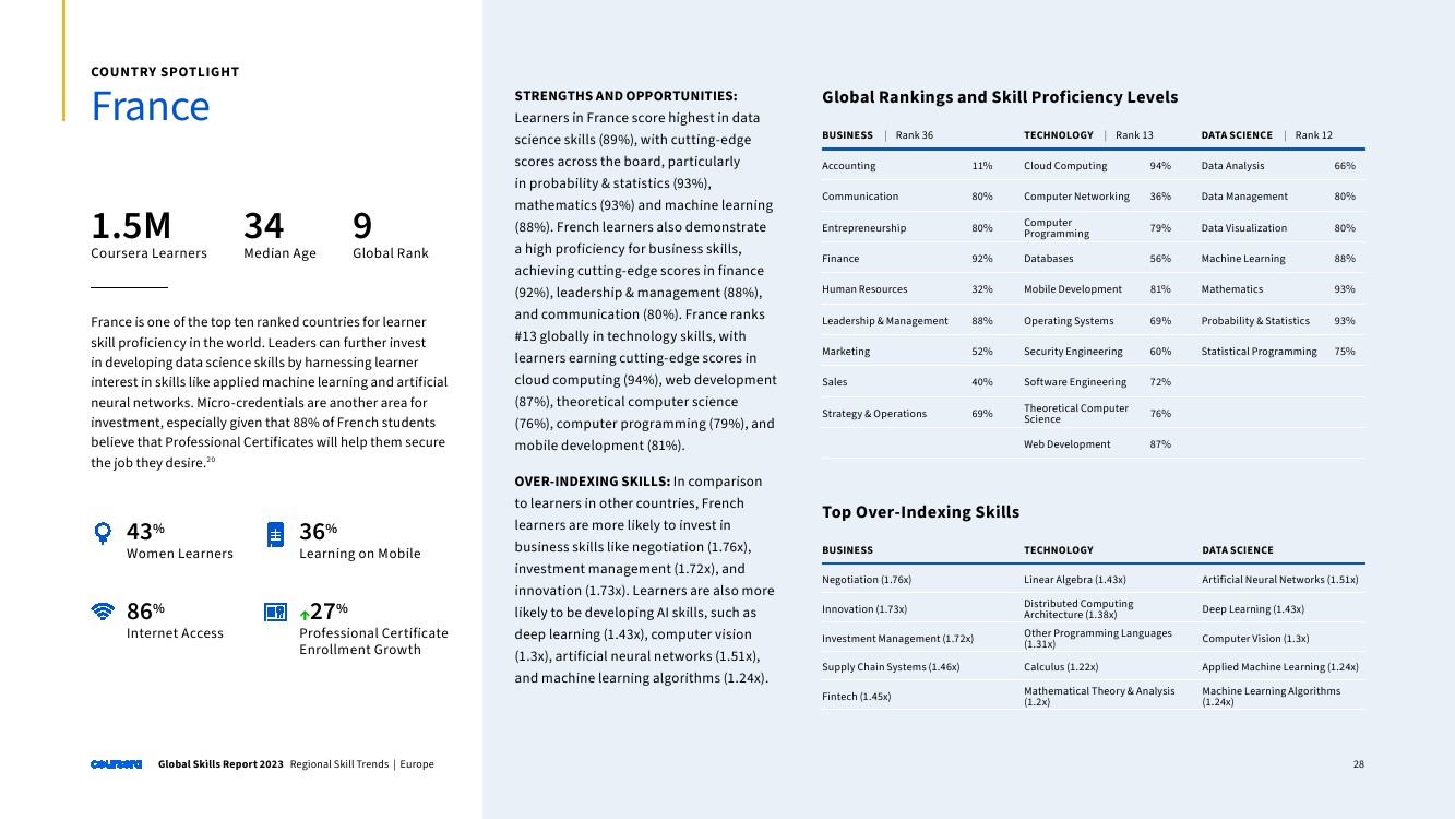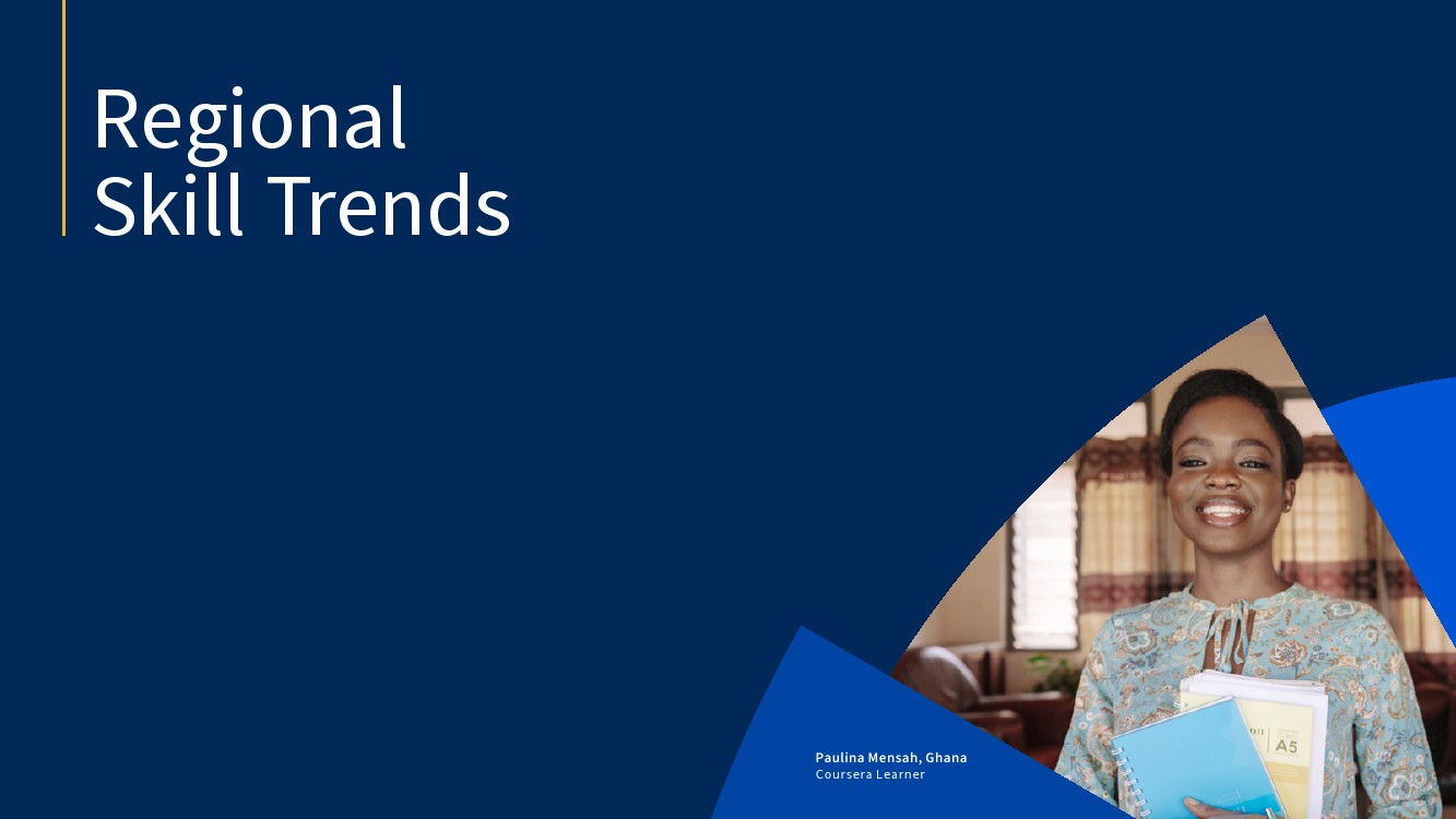欧洲在全球技能排名中领先,前十名中有八个国家来自欧洲。剩下的两个是印度尼西亚和日本。欧洲学生在商业技能方面表现突出,而拉丁美洲和加勒比地区的学生在技术和数据科学方面领先。