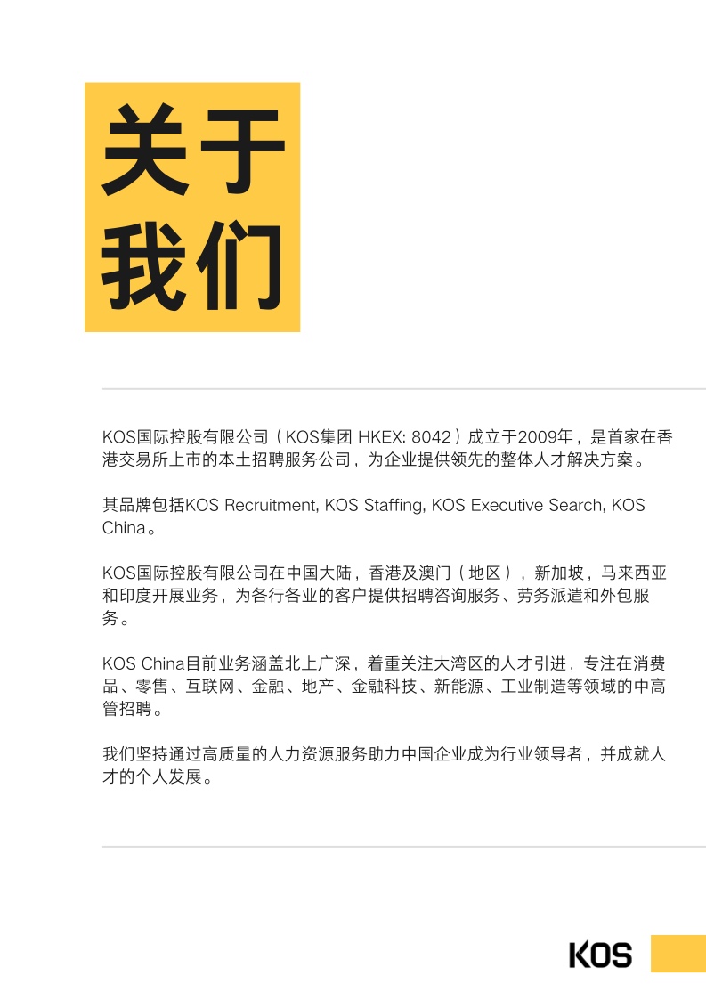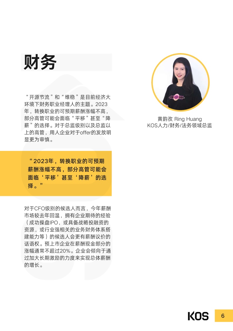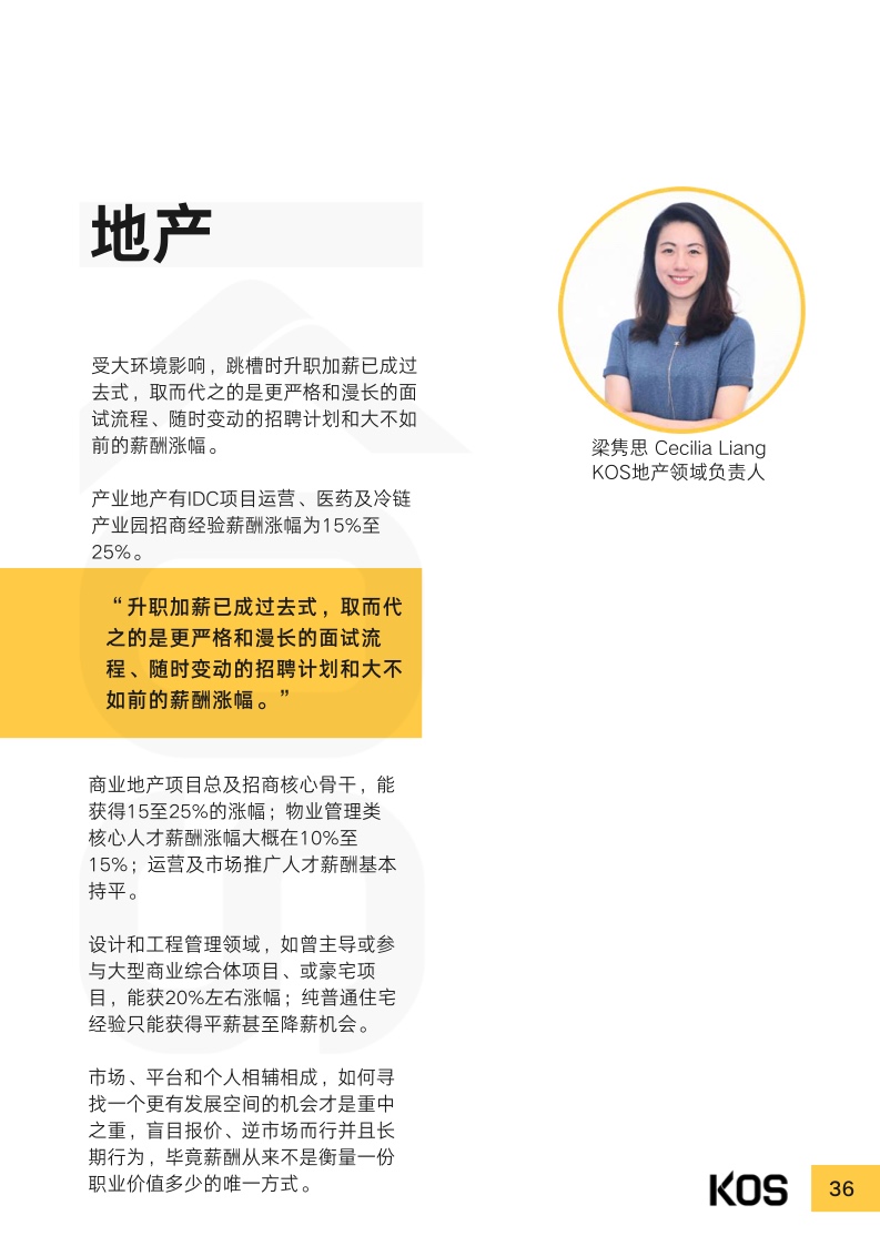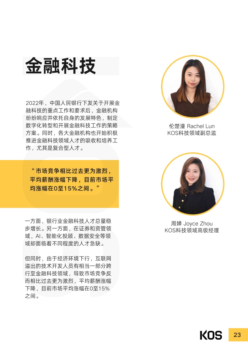 受过去几年疫情及宏观经济的影响,2023年上半年,处于恢复 期的企业依然重视成本控制。多数企业在制定招聘计划及薪酬涨 幅时,都趋于谨慎。常见跳槽薪酬涨幅集中于0%至15%之间, 而“平跳”甚至“降薪〞现象也并不少见,视具体情况而不同。尽管因为企业结构优化、降本增效等原因,目前人才市场整体处 于供大于求的局面,仍有不少行业因受利好政策扶持,或转型升 级,而存在人才缺口。