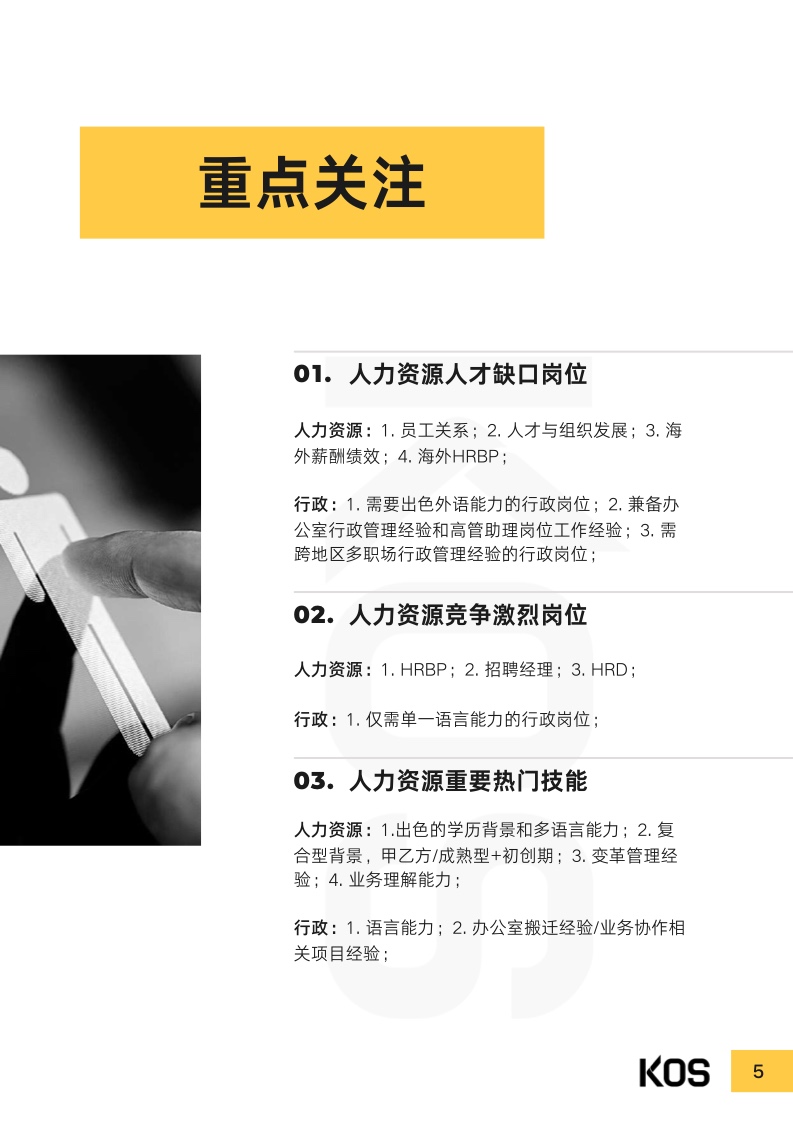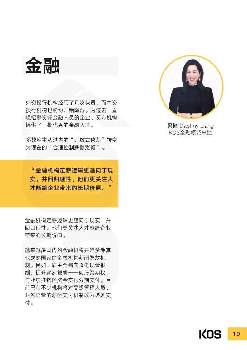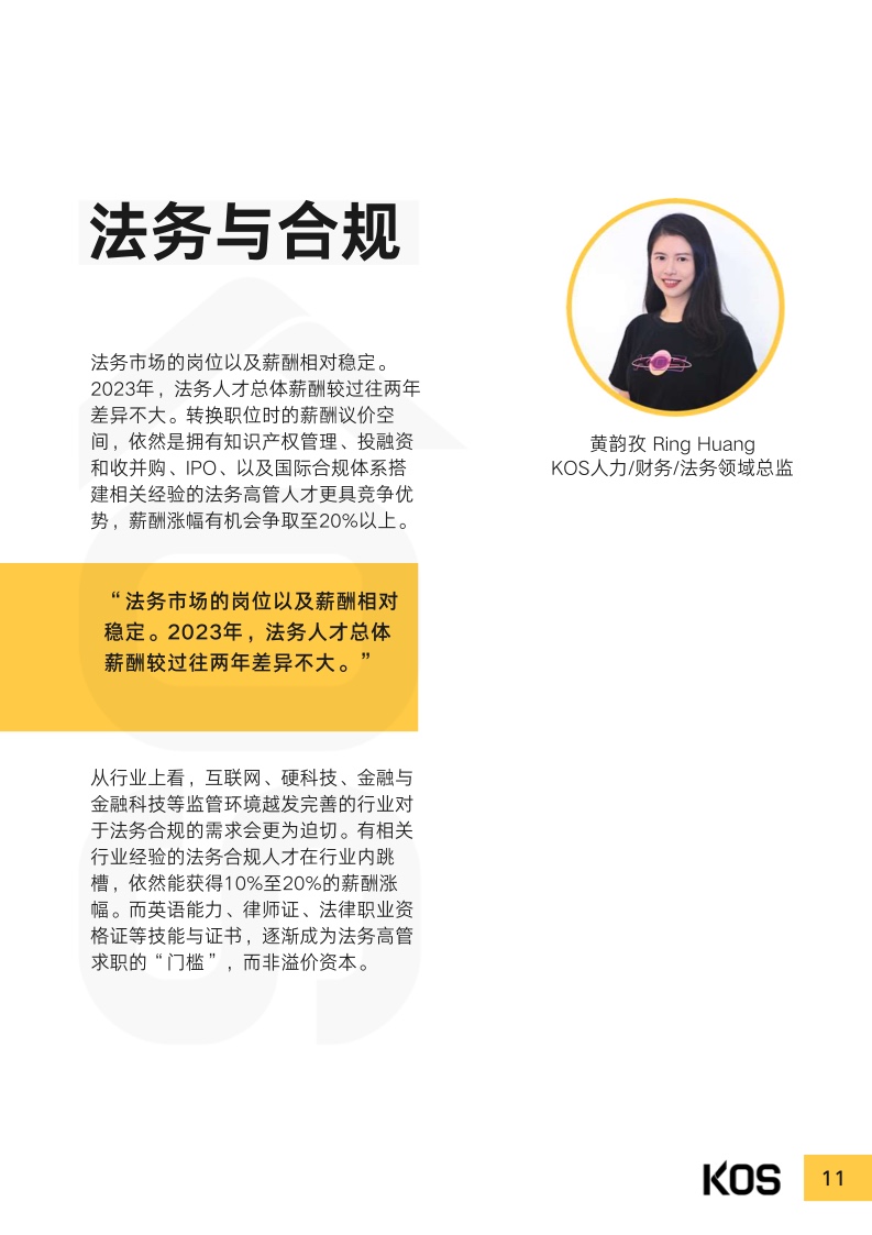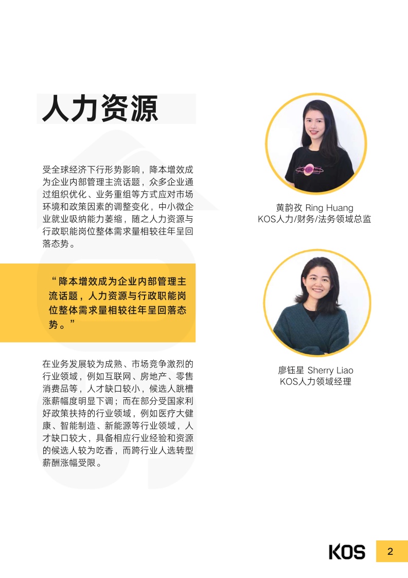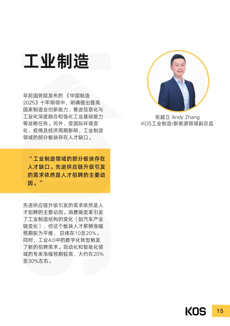 受过去几年疫情及宏观经济的影响,2023年上半年,处于恢复 期的企业依然重视成本控制。多数企业在制定招聘计划及薪酬涨 幅时,都趋于谨慎。常见跳槽薪酬涨幅集中于0%至15%之间, 而“平跳”甚至“降薪〞现象也并不少见,视具体情况而不同。尽管因为企业结构优化、降本增效等原因,目前人才市场整体处 于供大于求的局面,仍有不少行业因受利好政策扶持,或转型升 级,而存在人才缺口。