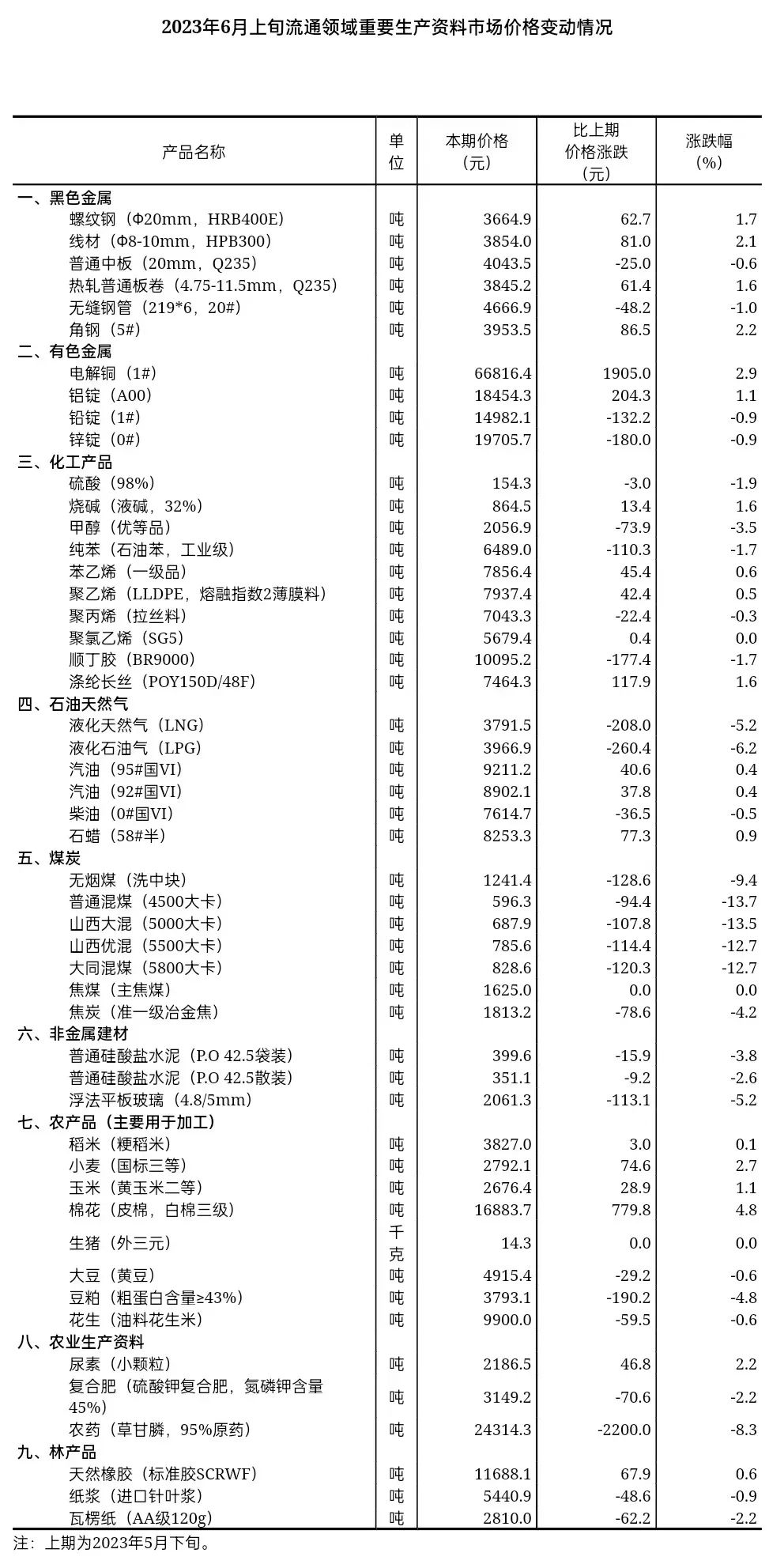 国家统计局:2023年6月上旬流通领域重要生产资料市场价格变动情况 据对全国流通领域9大类50种重要生产资料市场价格的监测显示,2023年6月上旬与5月下旬相比,19种产品价格上涨,28种下降,3种持平。 更多阅读:国家统计局:2022年3月下旬流通领域重要生产资料市场价格变动情况国家统计局:2022年3月上旬流通领域重要生产资料市场价格变动情况国家统计局:2023年4月中旬流通领域重要生产资料市场价格变动情况国家统计局:2020年7月中旬流通领域重要生产资料市场价格变动情况国家统计局:2021年6月上旬流通领域重要生产资料市场价格变动情况国家统计局:2023年3月中旬流通领域重要生产资料市场价格变动情况国家统计局:2022年11月下旬流通领域重要生产资料市场价格变动情况国家统计局:2022年9月下旬流通领域重要生产资料市场价格变动情况国家统计局:2022年10月中旬流通领域重要生产资料市场价格变动情况国家统计局:2022年5月上旬流通领域重要生产资料市场价格变动情况2023年4月上旬流通领域重要生产资料市场价格变动情况国家统计局:2023年8月下旬流通领域重要生产资料市场价格变动情况国家统计局:2023年8月中国采购经理指数运行情况国家统计局:2023年8月中旬流通领域重要生产资料市场价格变动情况国家统计局: 2022年我国经济发展新动能指数比上年增长28.4%