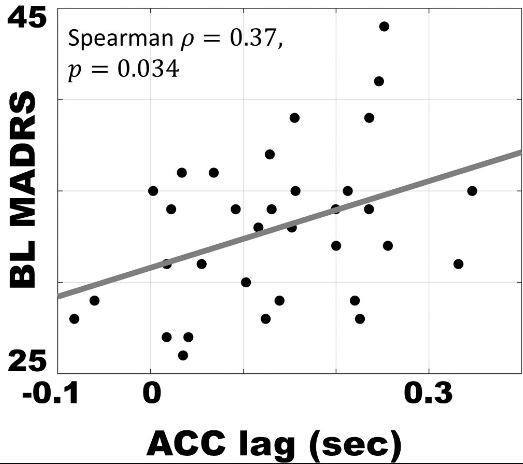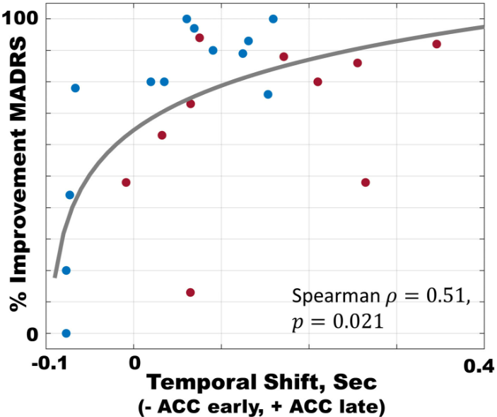 研究人员将试验参与者分为高响应组(MADRS评分下降>90%)和无响应组(MADRS评分下降<50%),高响应组表现出明显的ACC活动延迟,与试验中参与者的平均值相近。他们还发现,与无响应组相比,高响应组的基线MADRS评分更高,相关性分析显示,基线ACC时间结构与MADRS评分存在显著的相关性,表明ACC信号传导方向错误与抑郁严重程度有关。
