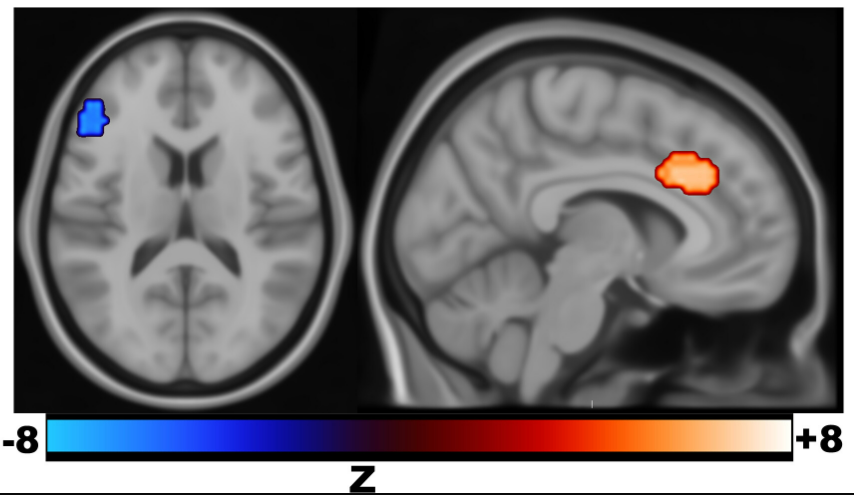 第一项试验的参与者基线时和治疗后的rs-fMRI数据对比确定了因SNT治疗而产生了显著时间结构变化的两个脑区,而假SNT对照组则没有相应变化,这两个脑区分别是SNT的刺激位置DLPFC和双侧ACC,左侧DLPFC相对其他脑区活动提前,而ACC相对其他脑区活动延迟。