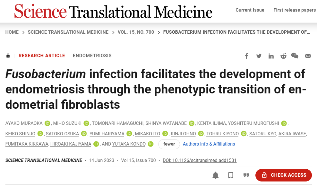 [1]Ayako Muraoka et al. ,Fusobacterium infection facilitates the development of endometriosis through the phenotypic transition of endometrial fibroblasts.Sci. Transl. Med.15,eadd1531(2023).DOI:10.1126/scitranslmed.add1531