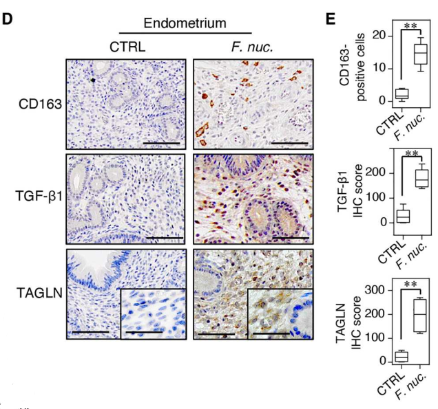 研究者们猜测,TGF-β1的存在可能与细菌感染有关。虽然普遍认为子宫内无菌,但是从公开数据集来看,子宫内膜异位症患者子宫内膜中有5个菌属显著增加。研究者依次进行了检查,发现排名第二的梭杆菌属非常值得一究。