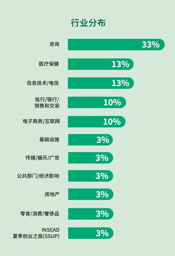 值得注意的是,由于INSEAD每年有两个intake的特殊性,在统计职业去向时,12月毕业班的数据还未完成统计,因此,每年的报告是综合了上一届12月毕业班(MBA’21D)及应届7月毕业班(MBA’22J)的数据。