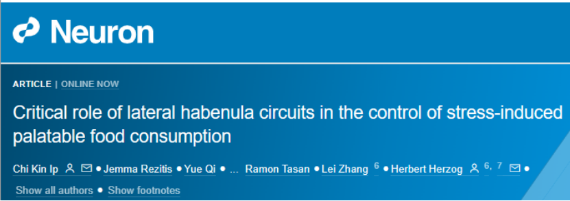 [1] Chi Kin Ip, Jemma Rezitis, Yue Qi, et al.Critical role of lateral habenula circuits in the control of stress-induced palatable food consumption,Neuron,2023,0896-6273.
