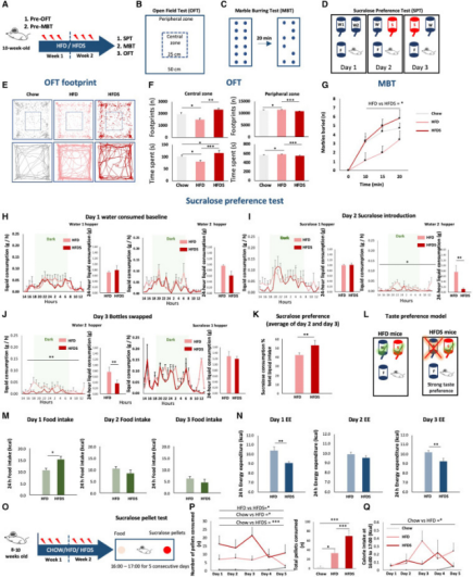 研究人员采用三氯蔗糖偏好(SPT)测试高脂肪饮食结合压力(HFDS)如何影响小鼠进食偏好。结果发现,HFDS小鼠消耗的三氯蔗糖是单独高脂肪饮食小鼠的三倍,这表明当处于长期压力下,不仅会增加进食量,还会尤其偏爱味道偏甜的可口食物。