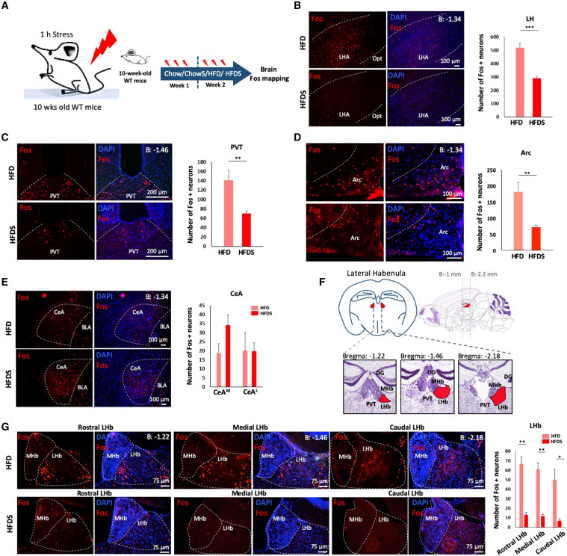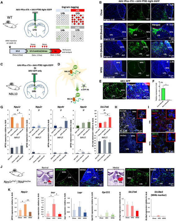 进一步探究发现神经肽Y1r(NPY1r)在高脂肪饮食(HFD)小鼠中表达活跃,而在HFDS小鼠中则表达减少。考虑到NPY在饮食控制以及压力和焦虑行为方面发挥着一定的作用,表明表达NPY1r的神经元可能介导HFD影响的LHb神经元组,并且对慢性应激治疗存在反应。