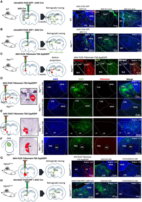 研究人员进一步明确了控制外侧缰核NPY1r神经元的神经元,发现了中央杏仁核NPY(CeA-NPY)神经元通过直接和间接NPY1R信号传导控制LHb。CeA-NPY神经元对LHb神经元有三种不同类型的抑制输入:①直接投射在LHb中表达NPY1r的神经元上;②通过减少共同表达NPY1r的LHb投射LH神经元的谷氨酸能输入来实现对LHb神经元的间接抑制;③通过表达LH谷氨酸能NPY1r的神经元进行控制输入。