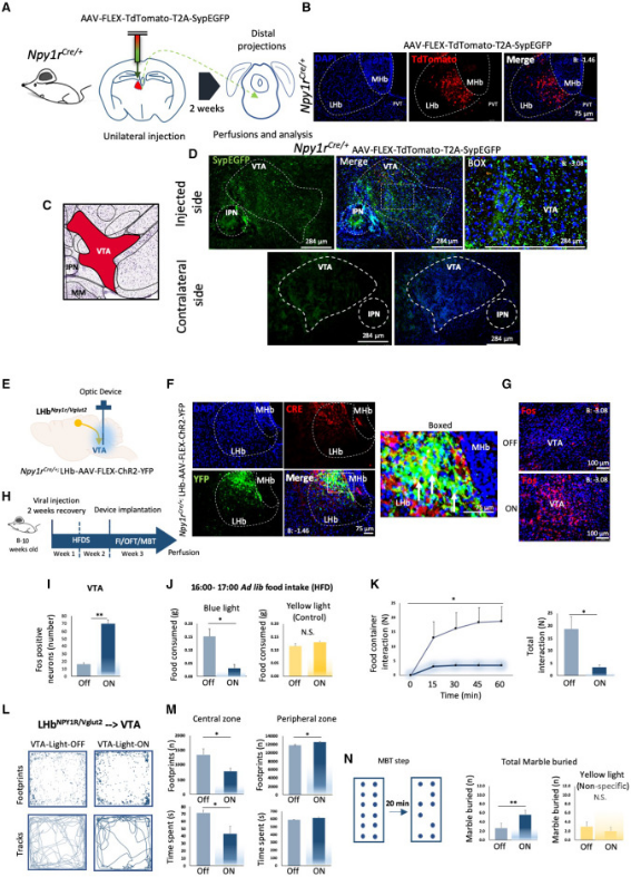 最后,明确了上游控制位置后,研究人员进一步鉴定LHb Npy1r神经元的下游靶标,发现腹侧被盖区(VTA)是最突出的目标。接下来研究了HFDS条件下LHb-NPY1R神经元输入VTA的急性激活对食物摄入和其他行为的影响,发现在HFDS条件下,VTA的重新激活抑制了食物的寻找和高度可口食物的消费。