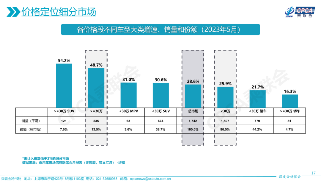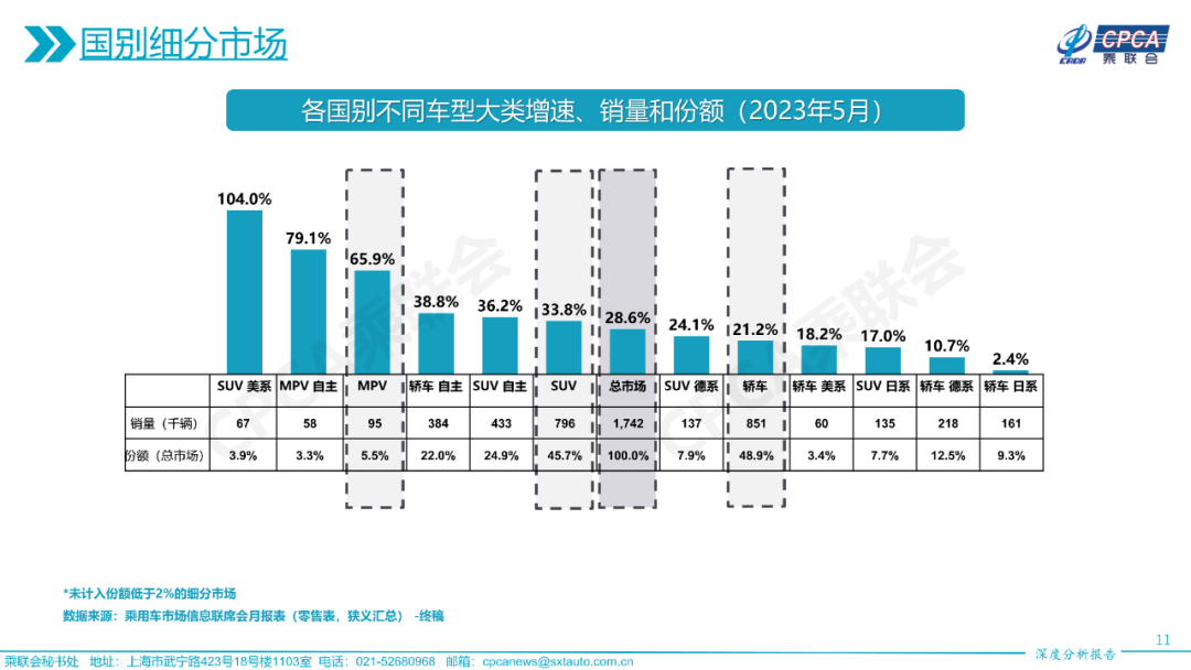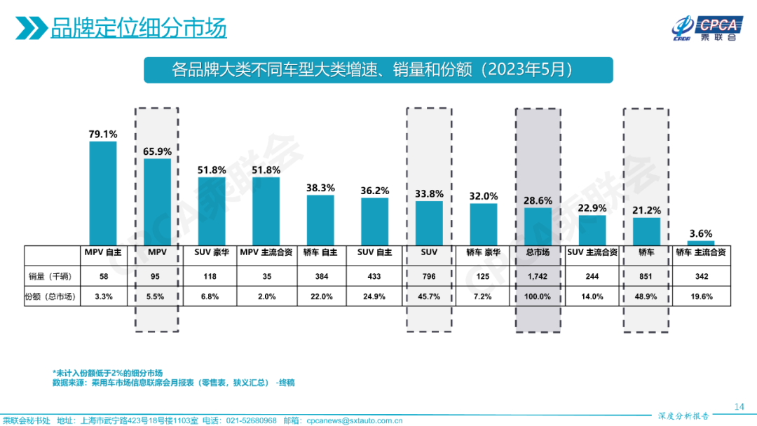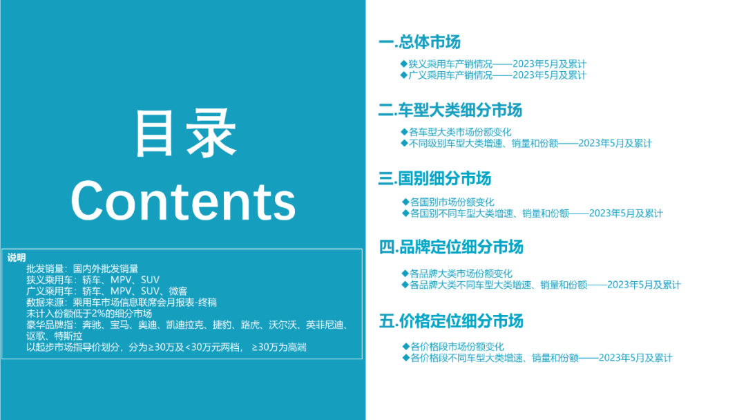 中国汽车流通协会:2023年5月份全国乘用车市场深度分析报告 一、总体市场 狭义乘用车产销情况——2023年5月及累计 广义乘用车产销情况——2023年5月及累计 二、车型大类细分市场 各车型大类市场份额变化 不同级别车型大类增速、销量和份额——2023年5月及累计 三、国别细分市场 各国别市场份额变化 各国别不同车型大类增速、销量和份额——2023年5月及累计 四、品牌定位细分市场 各品牌大类市场份额变化 各品牌大类下不同车型大类增速、销量和份额——2023年5月及累计 五、价格定位细分市场 各价格段市场份额变化 各价格段不同车型大类增速、销量和份额——2023年5月及累计 更多阅读:中国汽车流通协会: 2022年8月份全国乘用车市场深度分析报告中国汽车流通协会:2019年9月份全国乘用车市场深度分析中国汽车流通协会:2019年6月份全国乘用车市场深度分析中国汽车流通协会:2019年3月份全国乘用车市场深度分析中国汽车流通协会:2018年12月份及全年全国乘用车市场深度分析报告中国汽车流通协会:2018年9月份全国乘用车市场深度分析报告中国汽车流通协会:2018年8月份全国乘用车市场深度分析报告乘联会:2020年10月份全国乘用车市场深度分析报告乘联会:2022年2月份全国乘用车市场深度分析报告乘联会:2020年4月份全国乘用车市场深度分析报告乘联会:2022年4月份全国乘用车市场深度分析报告乘联会:2022年9月份全国乘用车市场深度分析报告乘联会:2021年9月份全国乘用车市场深度分析报告乘联会:2021年12月份全国乘用车市场深度分析报告乘联会:2021年11月份全国乘用车市场深度分析报告