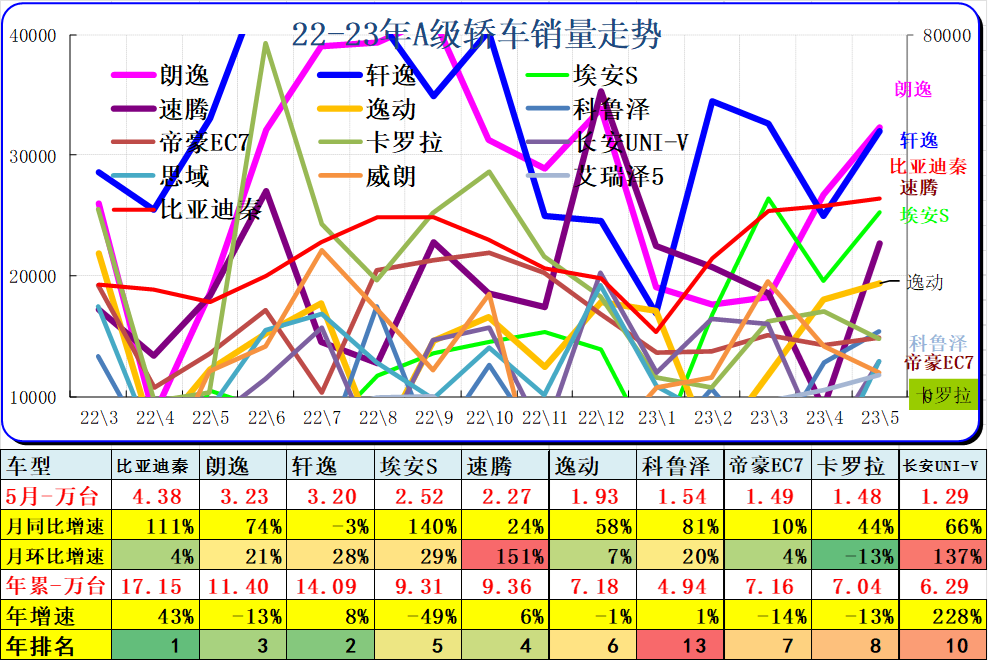 5月的A级车主力车型销量走势波动较大。合资主力车型仍有一定地位,德系主力阵容仍是较多的,一汽大众的主力车型都保持较高销量,德系朗逸和日系的轩逸表现不强。入门级自主A级车表现较好。自主的比亚迪秦、埃安S、帝豪等进入前10名。