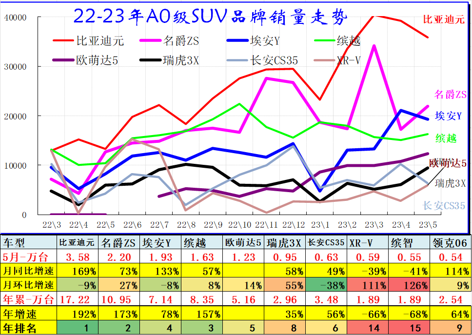 A0级SUV的主力车型变成电动车。A0级SUV基本都是时尚车型。比亚迪和广汽埃安电动车的表现很强,日系的燃油车表现退步。