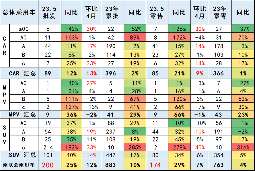 A0级轿车2023年5月批发10.52万台,占批发份额11.76%,批发较去年同期同比增长163%,批发环比今年上月增长1%;2023年5月零售较去年同期同比增长172%,零售环比今年上月下降4%。2023年1-5月批发数量42.5万台,厂家批发销售累计增幅89%;2023年1-5月国内零售数量30.53万台,零售累计增幅70%。