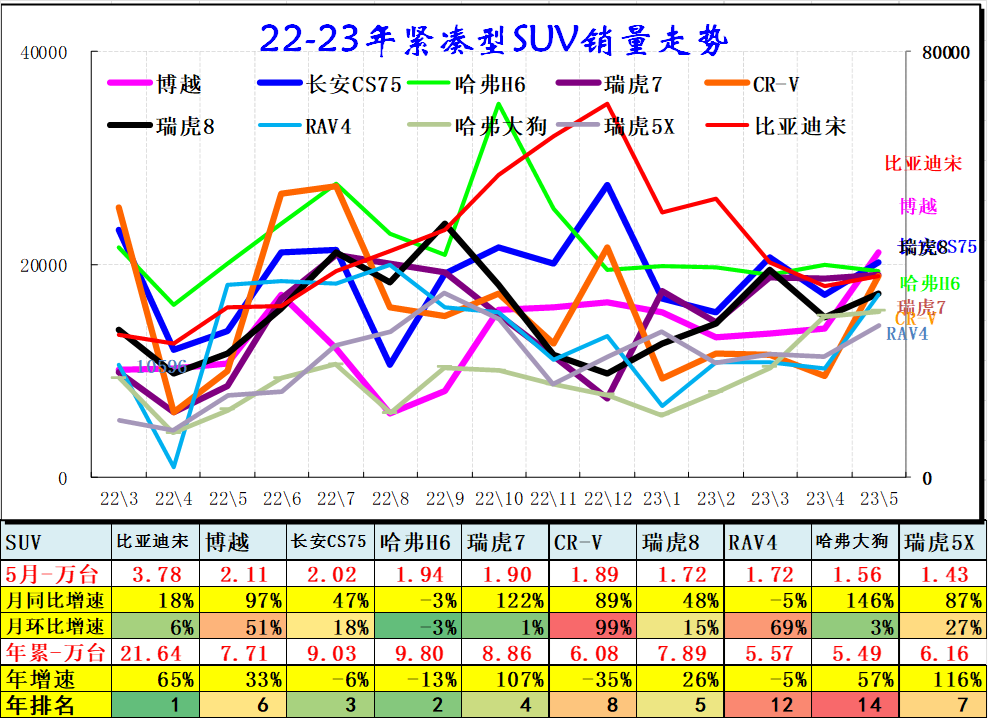 A级SUV 2023年5月批发领军变成新能源车型比亚迪宋,原有领军的自主燃油车SUV表现仍不错。合资SUV市场压力较大,高价位的SUV可以在动力和品牌间选择。比亚迪动力优势带动品牌优势。