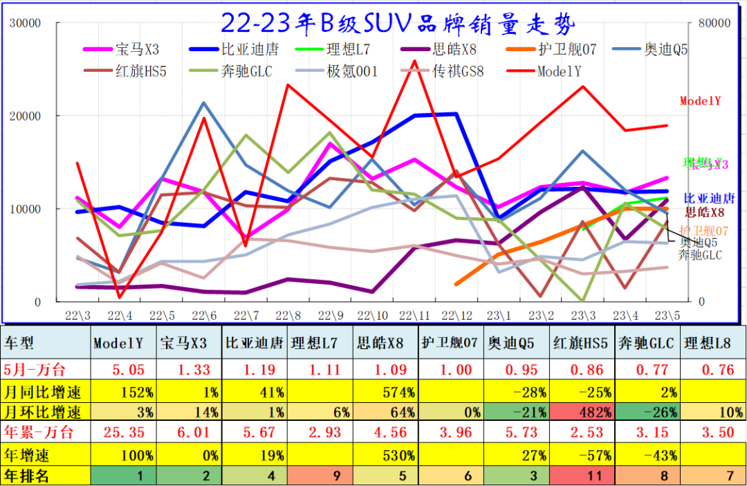 B级SUV 2023年5月批发市场仍是电动车领军,燃油车是奥迪、宝马较强,而豪华车在未来政策促进下仍会有较好表现。