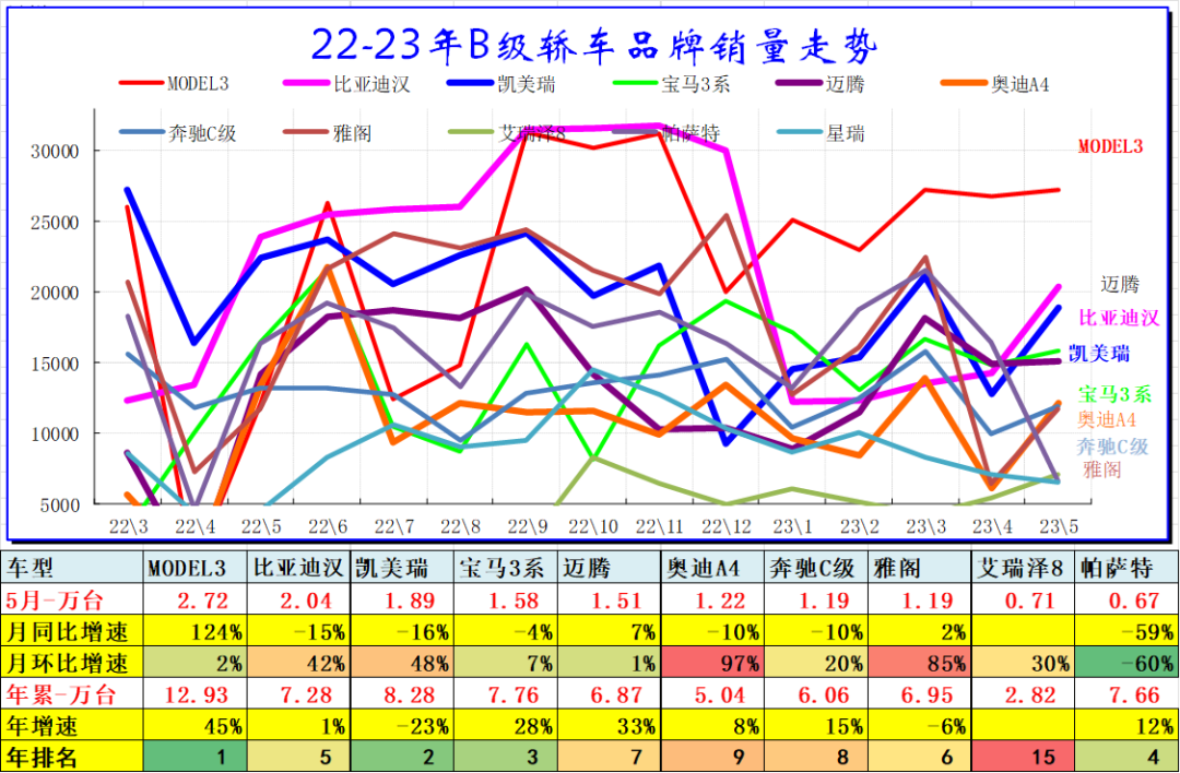B级轿车2023年5月批发22.49万台,占批发份额25.16%,批发较去年同期同比增长6%,批发环比今年上月增长2%;2023年5月零售较去年同期同比增长27%,零售环比今年上月增长1%。2023年1-5月批发数量114.13万台,厂家批发销售累计增幅13%;2023年1-5月国内零售数量102.68万台,零售累计增幅10%。