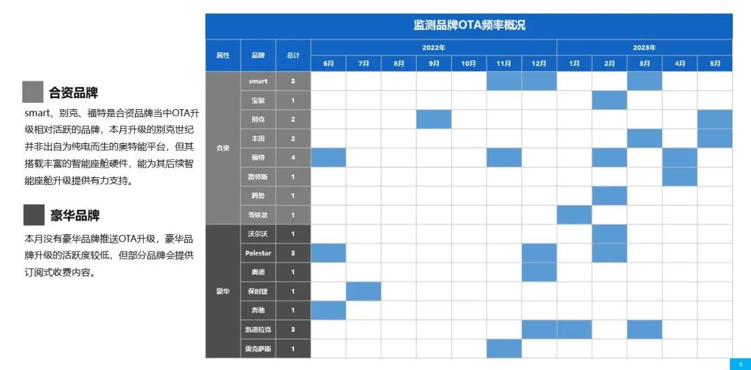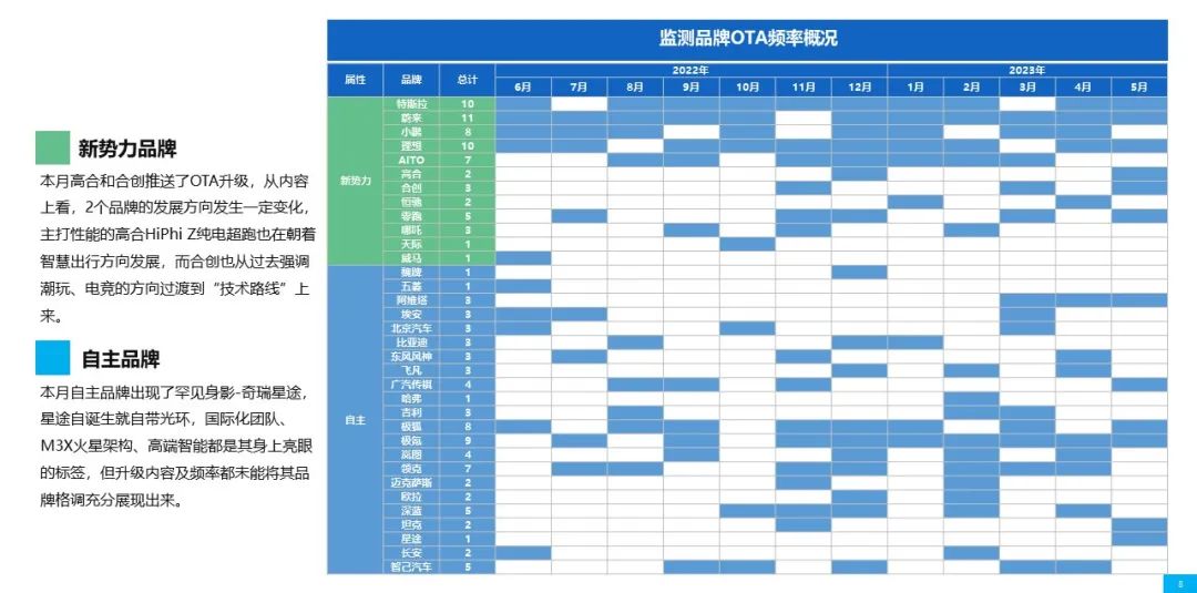 - 自主品牌共计更新99项内容,较上月有所下降。本月升级的品牌大多为传统自主品牌,长城坦克、奇瑞星途等都是OTA频率不高的品牌。