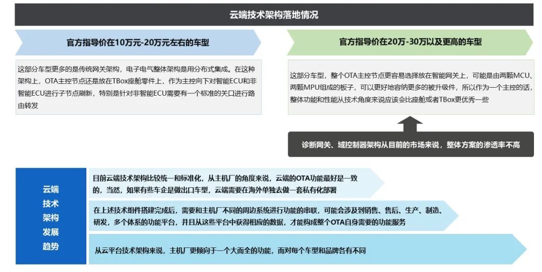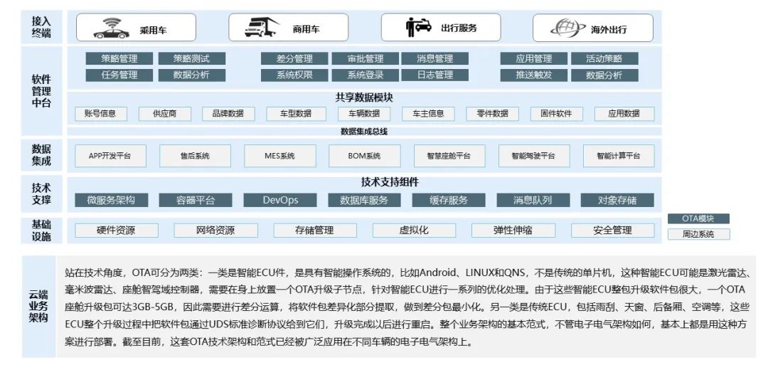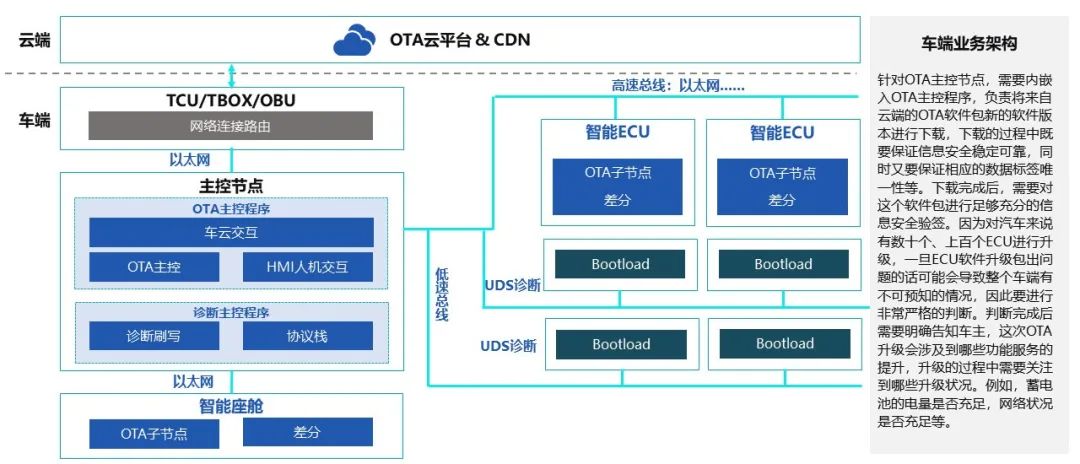 - 从技术架构来说,OTA是点对点的,基于无线网络的传输式方案,车端需要强力ECU作为整个OTA升级的主控节点,一般技术角度称为OTA Master(OTA主机)。作为主控节点是有多种形式的,对于偏老旧的分布式架构的车来说可能是TBox,可能是座舱大屏,而对域控制器来说可能就是偏重的域控节点。