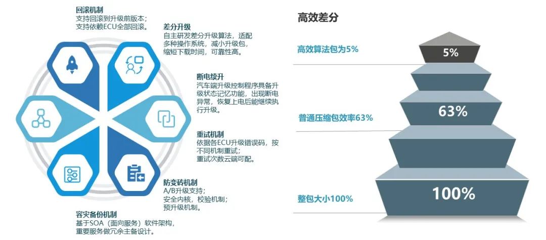 - 针对OTA的车端云端范式来说,主机厂关键考核OTA功能的核心特性比较简单:一定要做到安全、稳定、可靠,行业中不乏一些因OTA升级失败案例,因此对OTA整体功能需要提升技术保障。另外OTA升级过程一般较长,从消费者的主观意愿和用户感知来说会比较差,需要一个高效的差分能力,把软件升级包压缩到最小化,缩短整个OTA的升级时间。OTA还需要关注的一个指标是安全法规的问题。