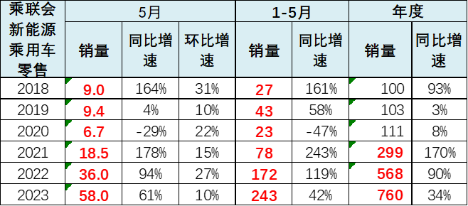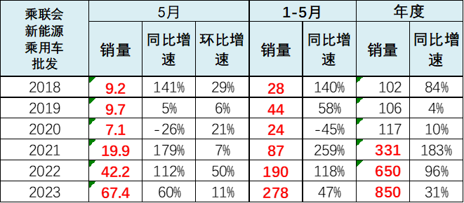 1-5月新能源乘用车批发销量达到278万辆,同比增长47%。