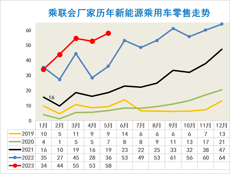 5月新能源车市场零售58万辆,同比增长61%,环比增10%。