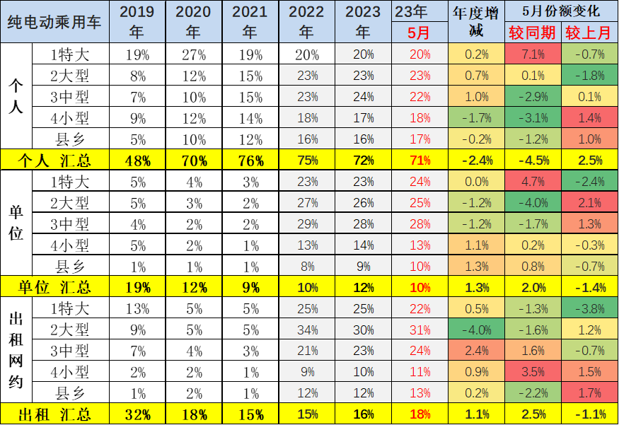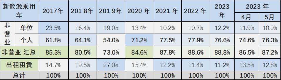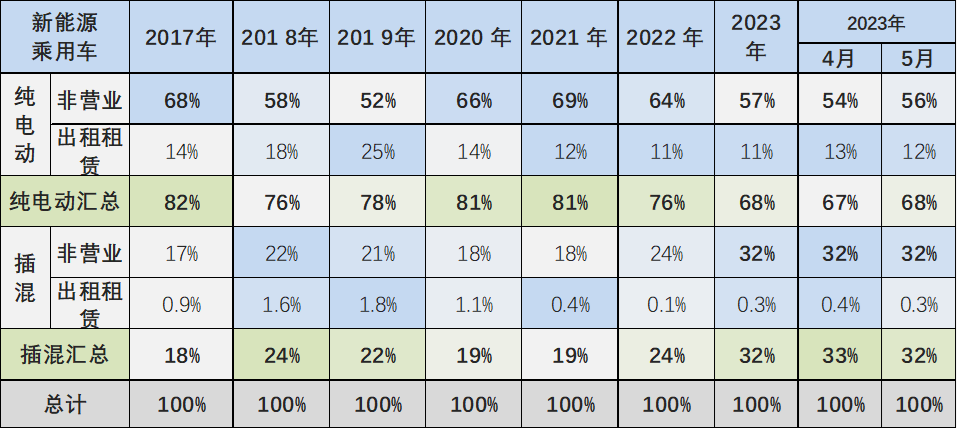 2018-2019年新能源乘用车的出租租赁类占比逐步提升,随后2020年开始的纯电动出租租赁的占比持续下降。今年的市场需求逐步走稳,纯电动2023年5月出租租赁的占比在12.8%,较年初稍有提升。