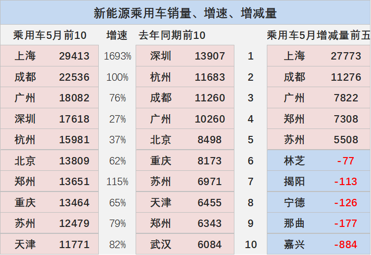 5月的新能源车增长主力是前期受抑制的疫情重灾区,限购的上海、广州、杭州等限购表现仍较强。5月的新能源车增长主力还有武汉和郑州等非限购核心大城市。下滑的是嘉兴和那曲等小车市场区域。