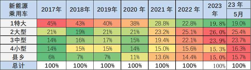 新能源乘用车前几年主要在限购特大城市需求较强,近期持续下行。2023年新能源乘用车在特大城市占到总销量20%,较2022年下降3个百分点,这也是说明限购城市的新能源车市场销量逐步增速放缓,基础的人口规模对需求有约束。由于人口基数大、公共交通差,近期的大中型城市市场需求旺盛,县乡市场新能源逐步启动。