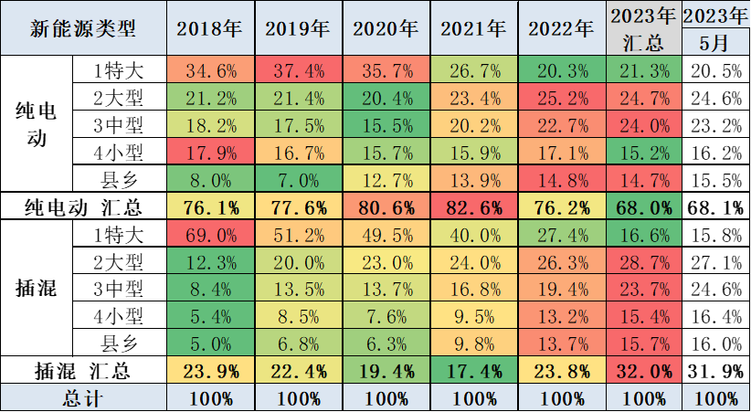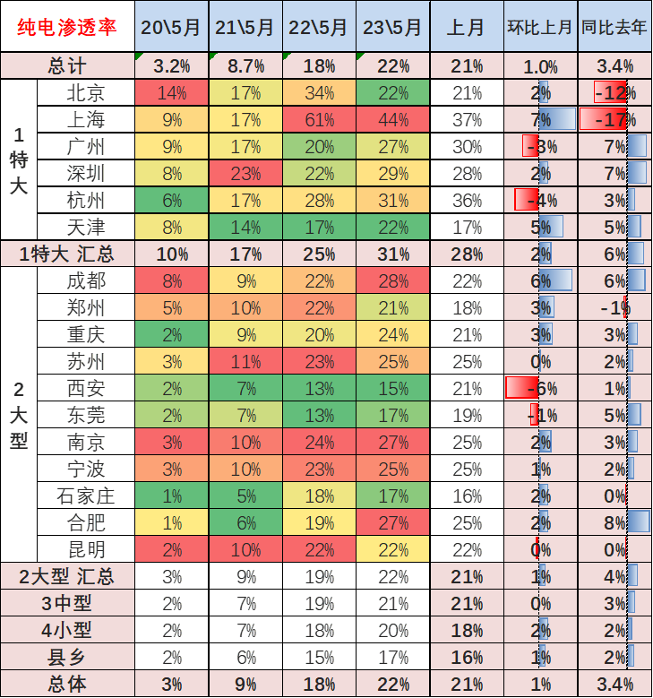 而非限购城市中的大型城市、中型城市和小型城市的新能源车的纯电动车的销量占比基本相同,2019年和2020年都在偏低的水平,今年中等城市的5月上升到22%,县乡市场的渗透率提升表现也是较强。