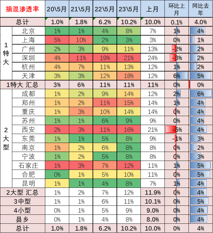 插混在全国各地市场渗透率都持续增长,尤其在特大型城市,今年5月插混车市场占比达到11%;在中小城市市场的插混市场的占比也呈现持续提升的特征,各类城市间的插混渗透率差距相对缩小。