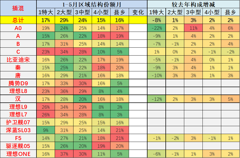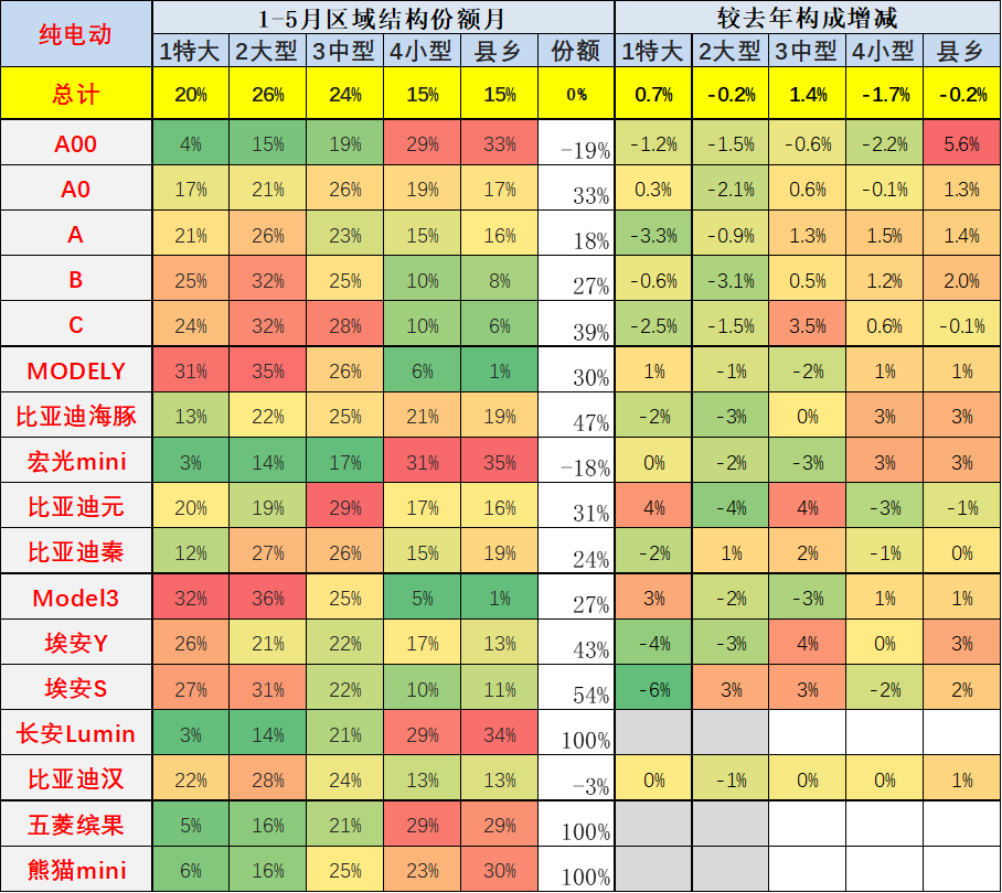 从主力车型的表现来看,也是体现了主力车型在大中城市的表现改善,尤其是5月以比亚迪为代表的增量,相比较同期的份额增量是中型市场增长1-2个百分点。从特斯拉来看, 5月份较同期的的主力区域更延伸到县乡市场,特大型城市的纯电动市场增长相对较好。