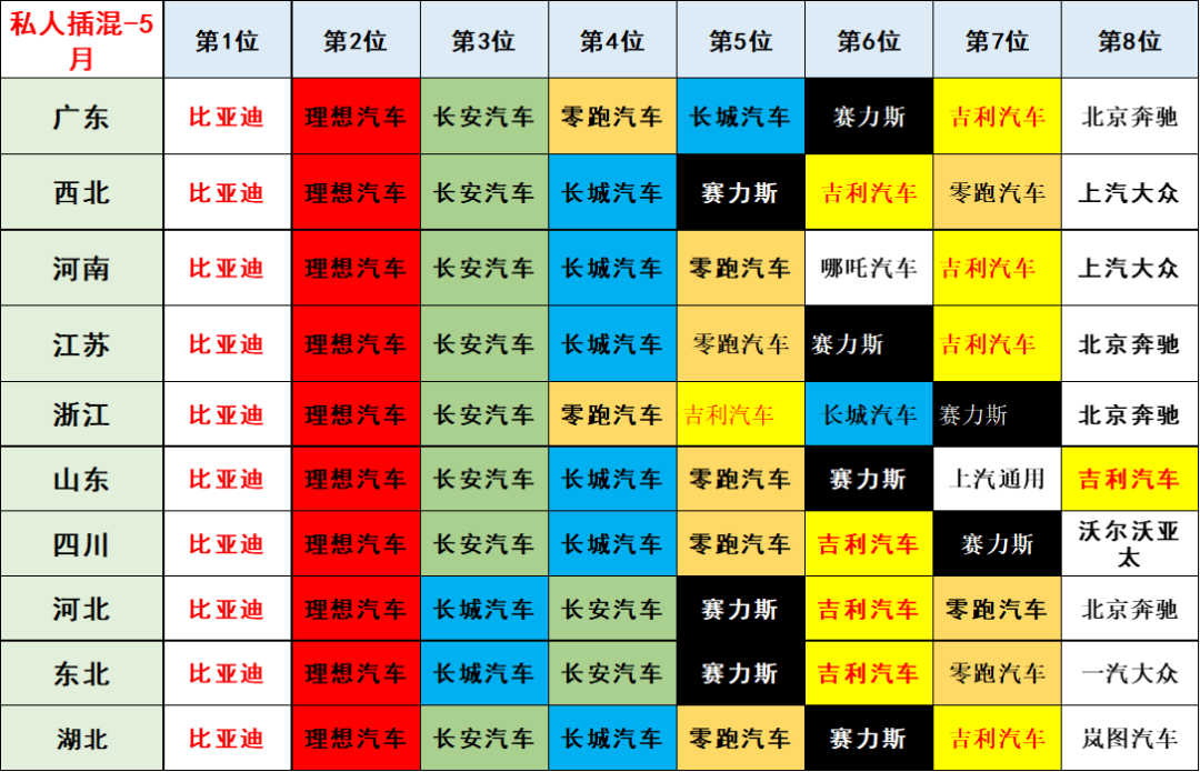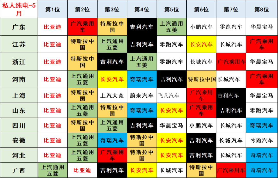 私人纯电动市场的特色相对鲜明,高端化趋势极其明显。比亚迪表现优秀,广东、江苏、浙江等发达地区基本都是第一。