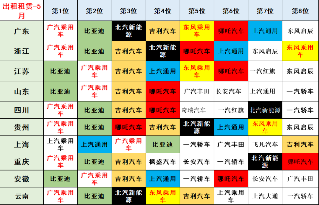 各地出租市场的表现相对差异化较大。今年5月表现较强的出租市场是广东、浙江、江苏等。其中各个厂家在各地的出租市场表现也是差异较大,有些地区的本地产品在本地出租市场的占有率并不一定很高。
