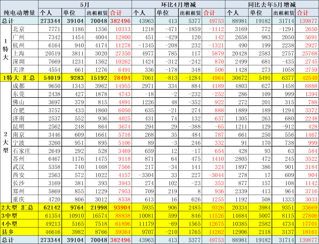 5月的各地出租市场更新电动化力度较大。尤其是广州、上海、杭州等地区相对于前几年的5月更新数量大幅增长,体现电动化的公共领域较强特征。