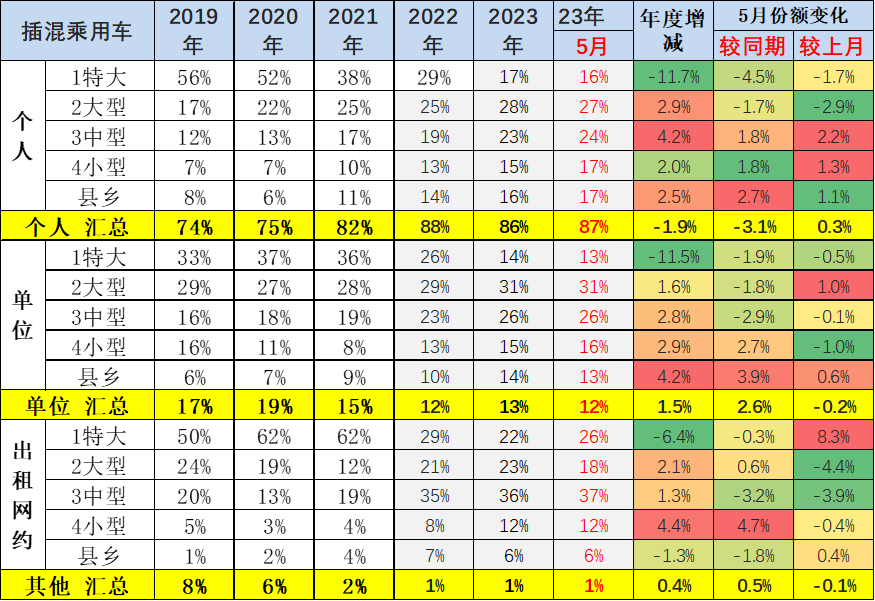 插电混动车型的单位用车和出租占比持续萎缩。插混出租租赁车型主要的需求在特大城市和大型城市市场,今年的特大型城市插混出租大幅萎缩。