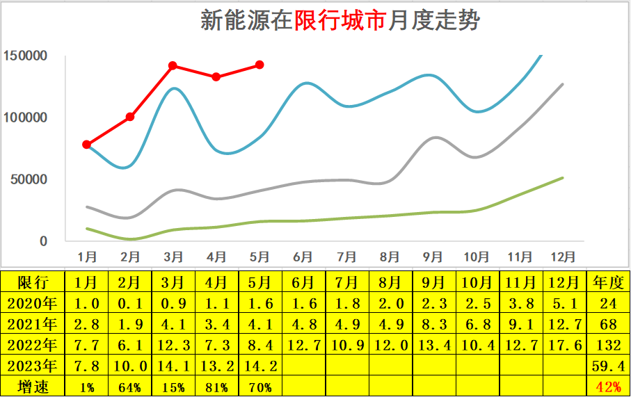 新能源车在限行城市的表现相对较强,2023年5月份达到14万台水平,同比增长速度达到70%的较好水平。