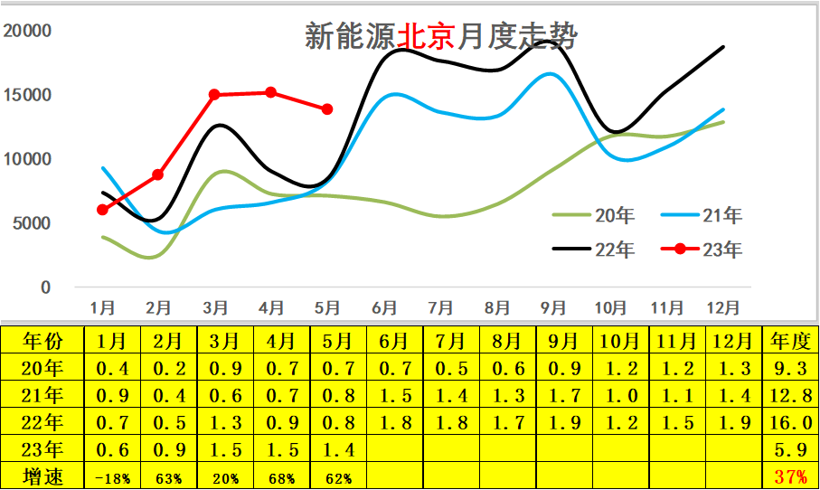 北京市场2022年新能源车市场走势相对较平稳,2023年5月销量达到1.4万台,大幅高于去年同期,牌照指标充分消化。2023年的累计销量同比增长37%的表现较好。