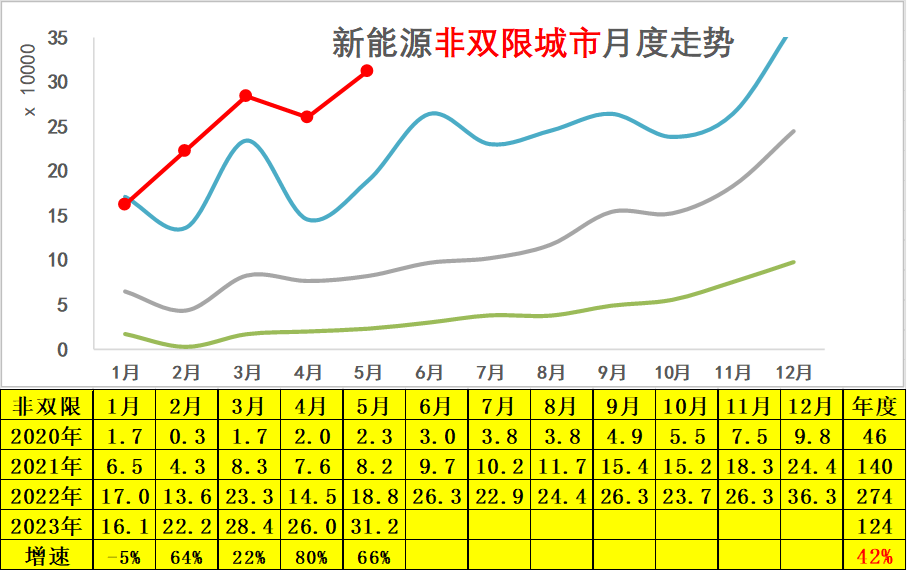 2022年非双限城市累计达到274万台水平,同比增长96%,呈现了强势增长特征。2023年新能源车在非双限城市的表现极其优秀,5月份销售31.2万台的增速66%。