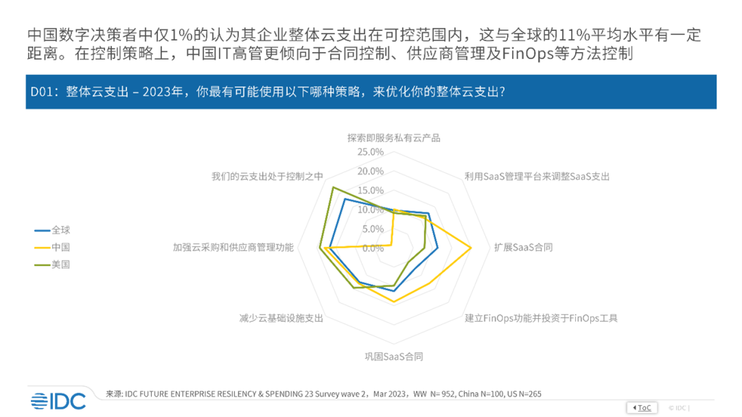中国数字决策者中仅1%的认为其企业整体云支出在可控范围内,这与全球的11%平均水平有一定距离。在控制策略上,中国IT高管更倾向于合同、供应商管理及FinOps等方法控制。