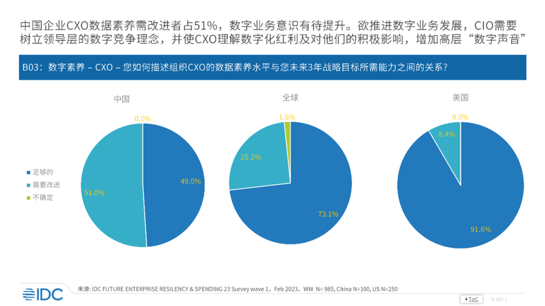 中国企业数据素养需改进的 CXO占51%,对于数字决策者而言,推进数字化转型及数据治理存在一定的高层阻碍且缺少高层业务的支持。